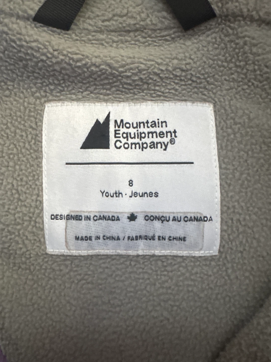 This Mountain Equipment Company rain jacket and pants set is designed for youth. The jacket is purple with a grey fleece lining, and the pants are black. Both are made of waterproof material. It's great for keeping kids dry on rainy days!