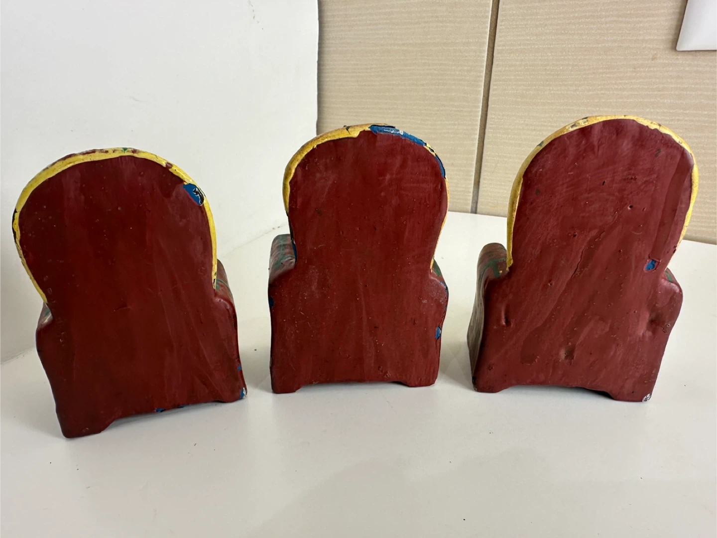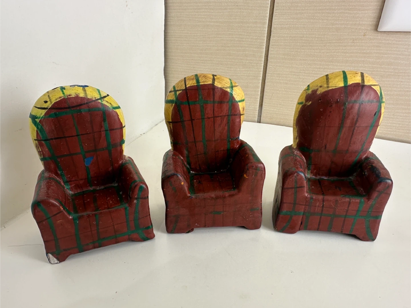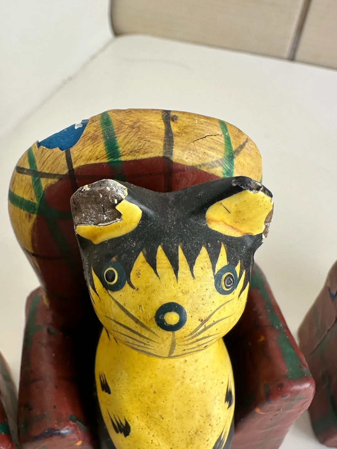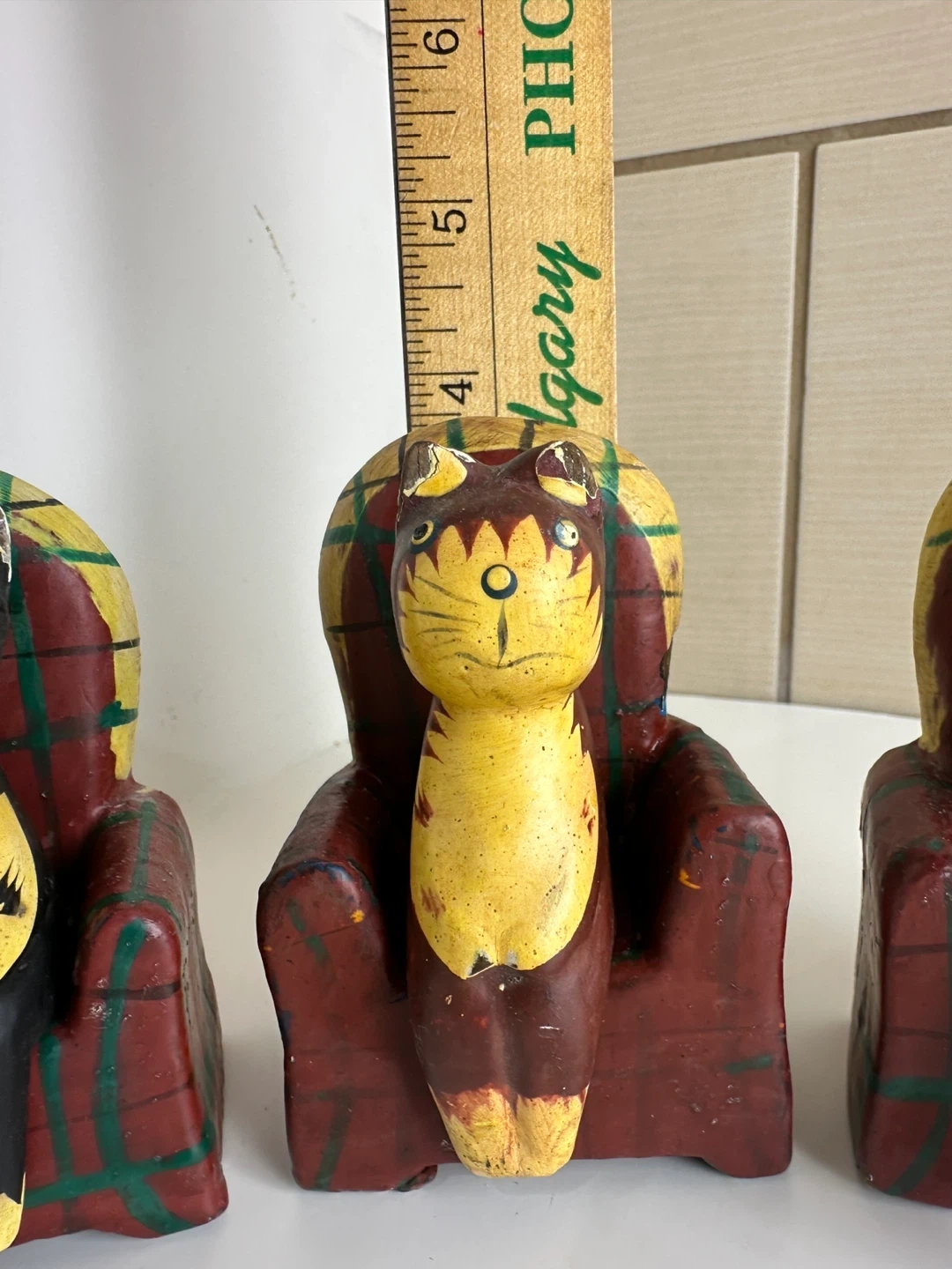 Here are some cute vintage cat figures! They feature cats sitting in plaid chairs. They are made of wood and have some signs of wear, but they are still in good condition