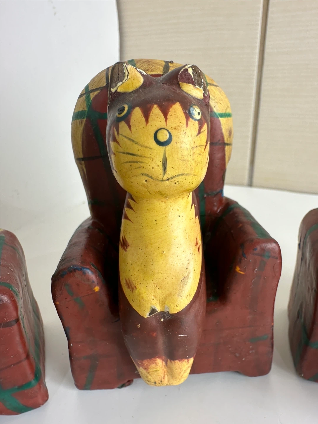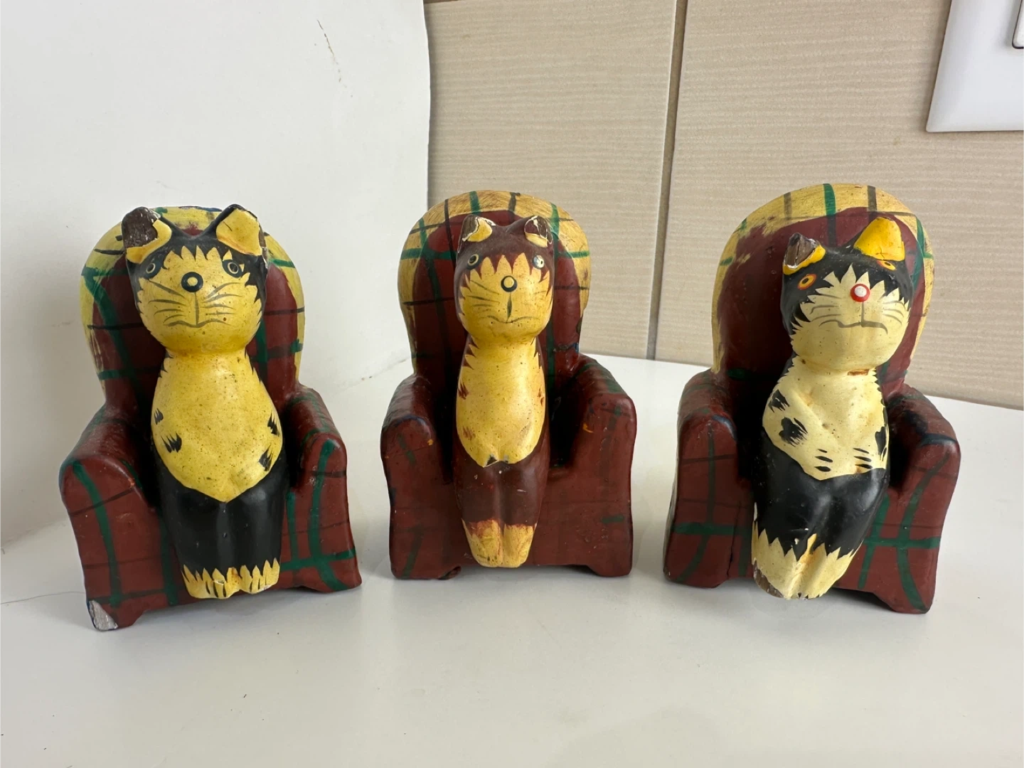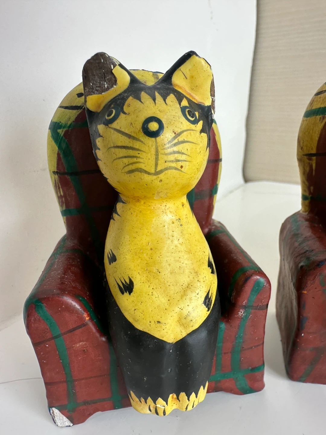 Here are some cute vintage cat figures! They feature cats sitting in plaid chairs. They are made of wood and have some signs of wear, but they are still in good condition