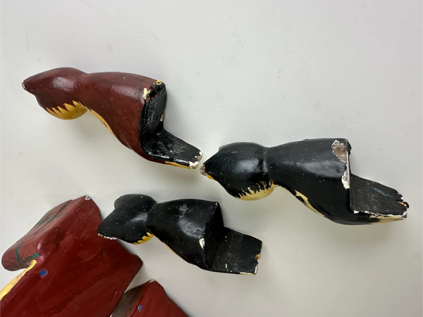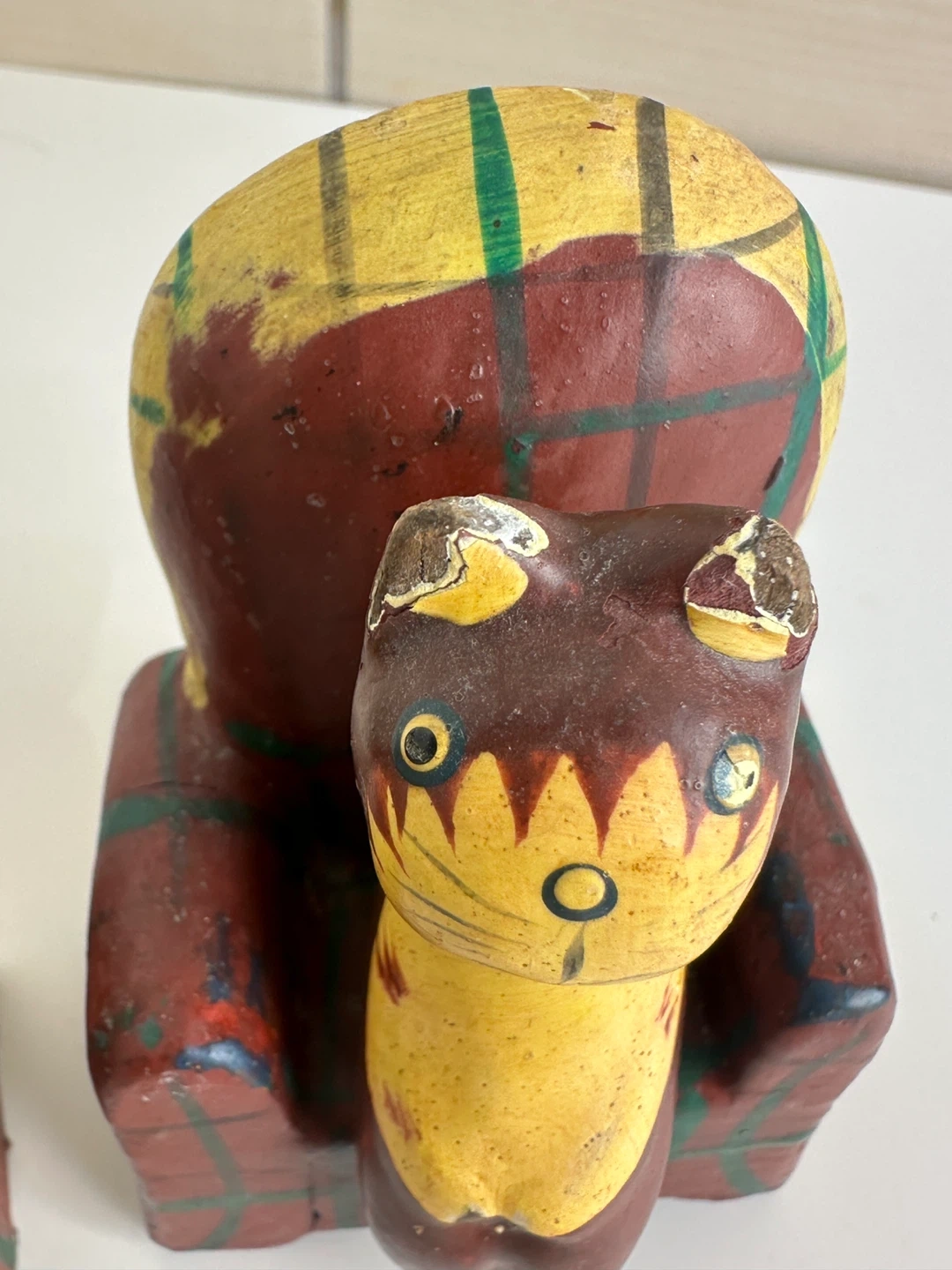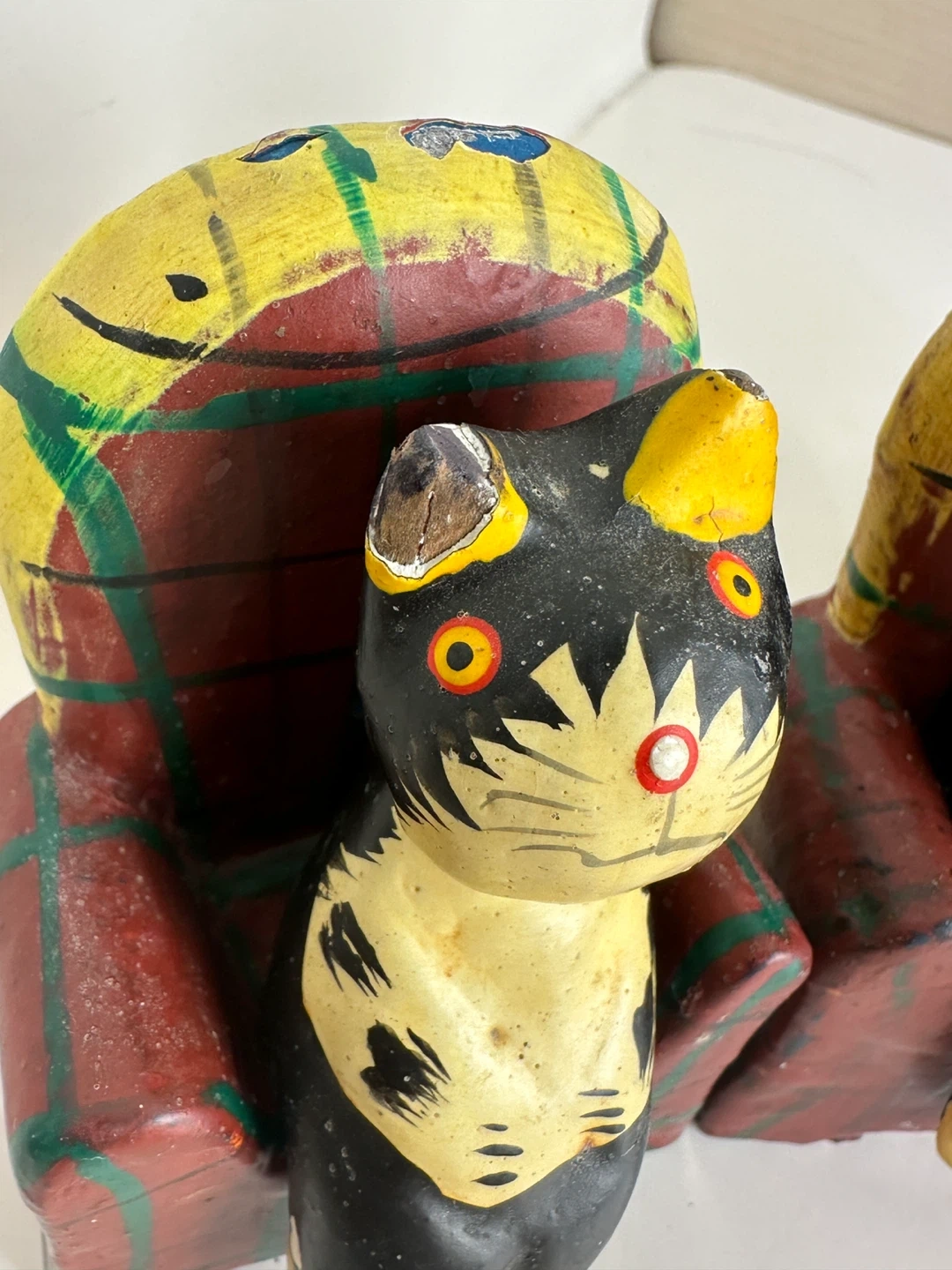 Here are some cute vintage cat figures! They feature cats sitting in plaid chairs. They are made of wood and have some signs of wear, but they are still in good condition
