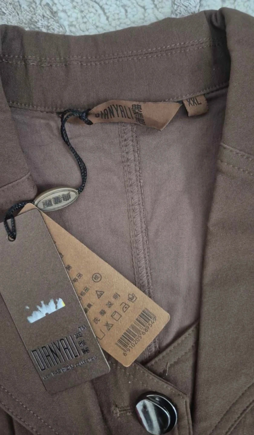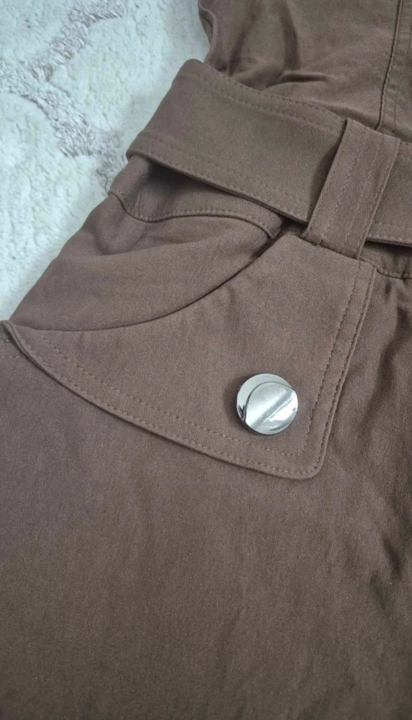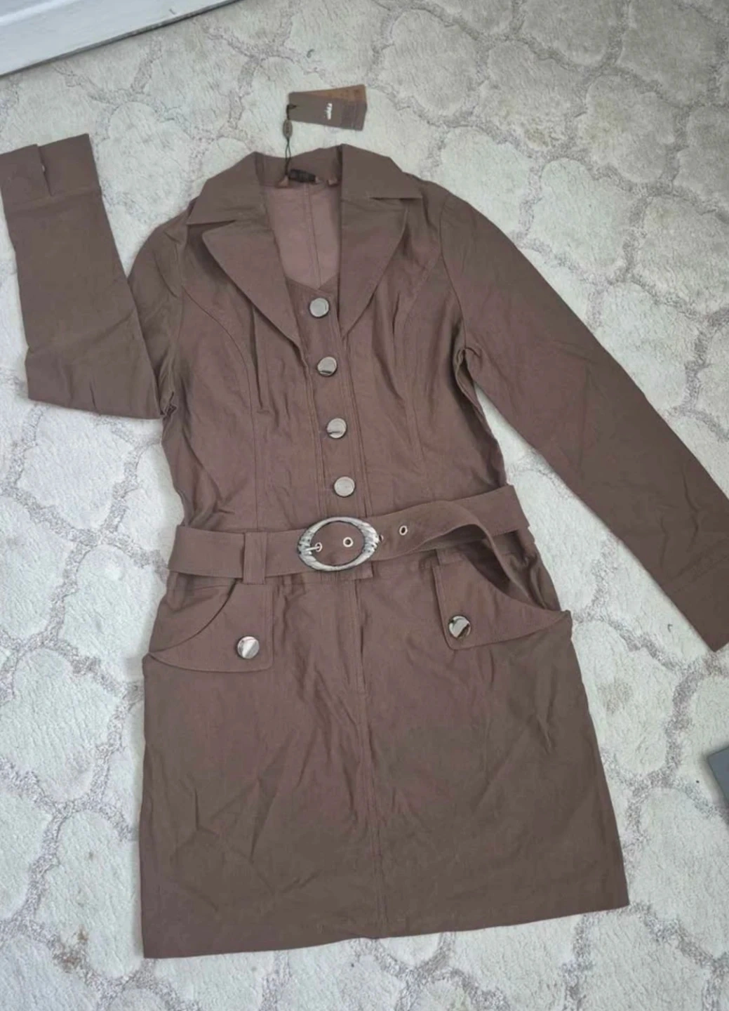 This DANYALI dress jacket comes in a rich brown colour. It features a stylish belt with a decorative buckle and silver-toned buttons. The jacket includes two flap pockets on the front.