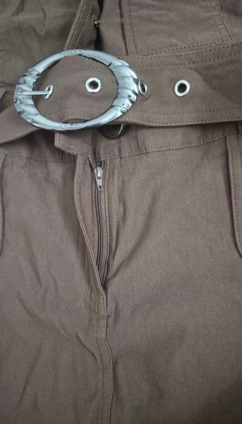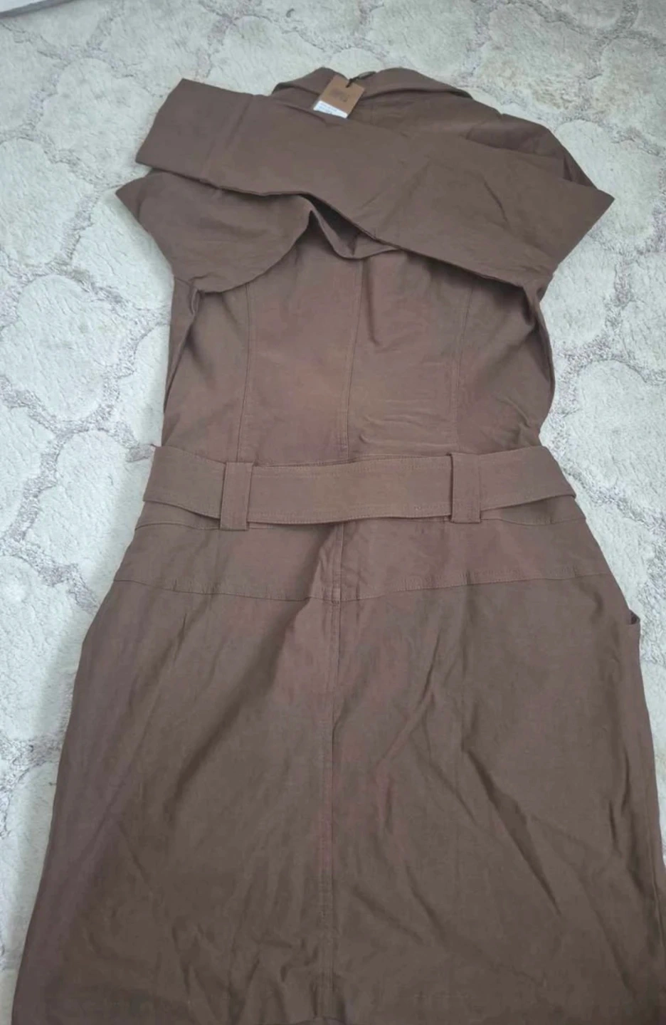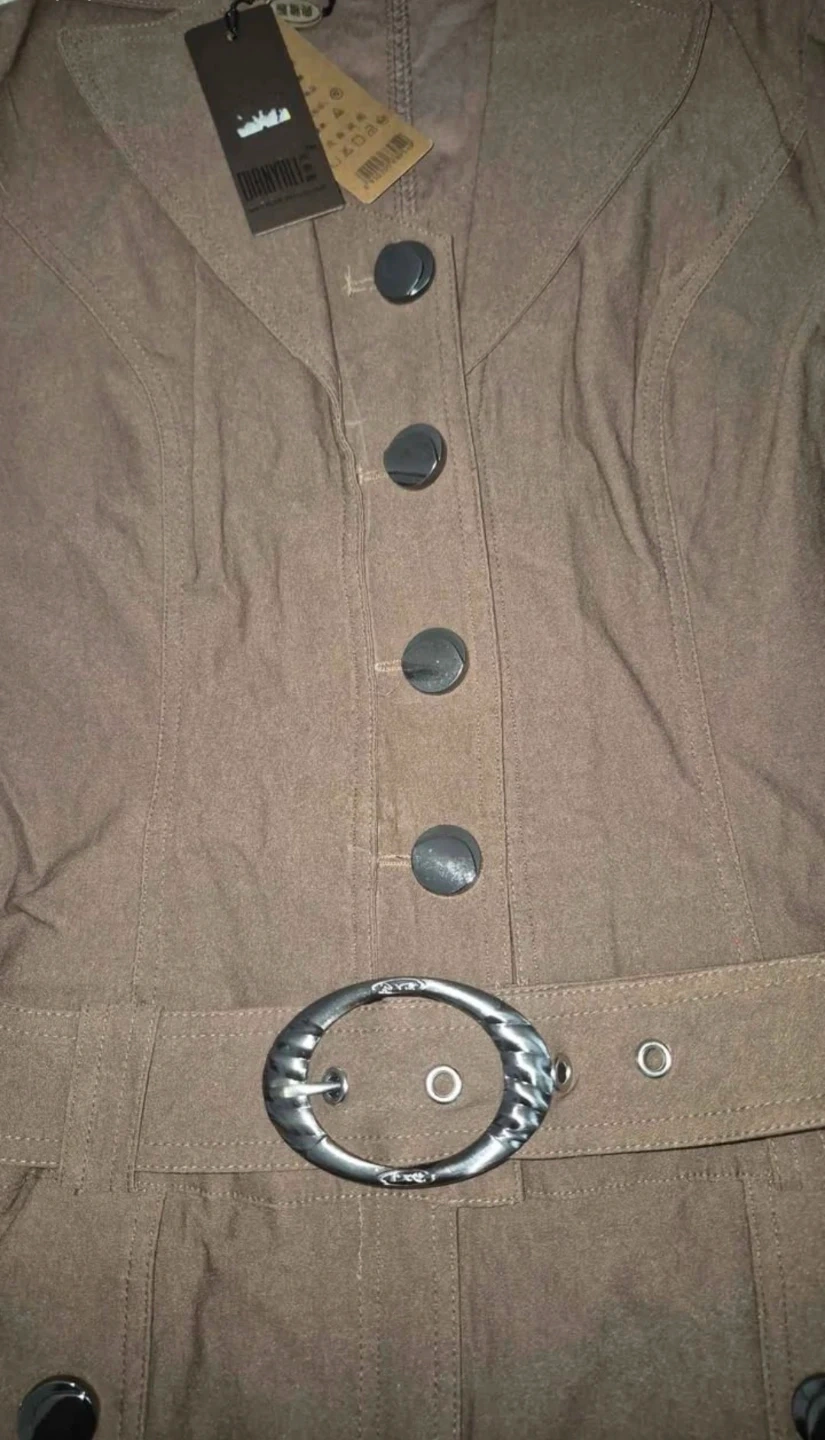 This DANYALI dress jacket comes in a rich brown colour. It features a stylish belt with a decorative buckle and silver-toned buttons. The jacket includes two flap pockets on the front.