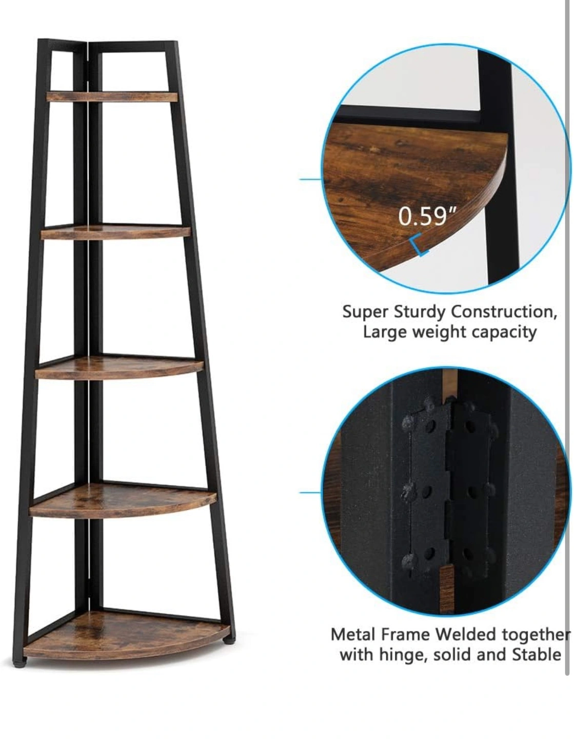 This 5-tier corner shelf is perfect for adding storage and style to any room. It features a sturdy metal frame and rustic wood shelves, making it both durable and attractive. The corner design is ideal for maximizing space in small rooms, and the five shelves provide ample storage for books, plants, photos, and more.