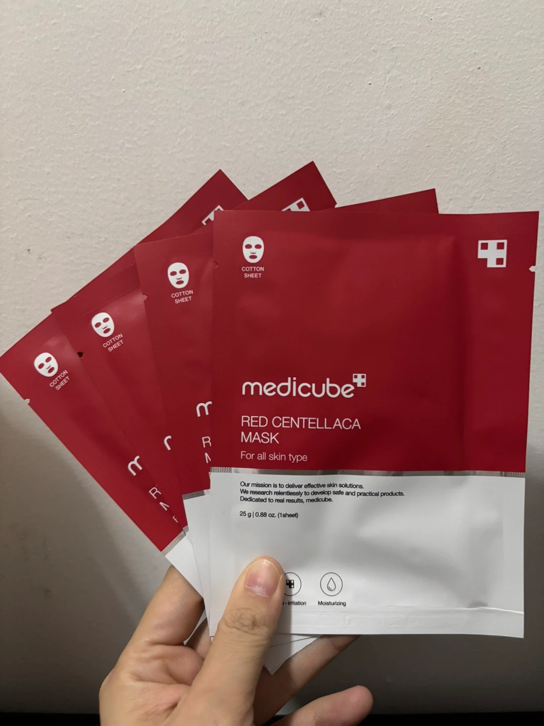 This is a 5-pack of Medicube Red Centellaca Masks. Each mask is 25g or 0.88 oz. They are made with cotton sheet. Suitable for all skin types.