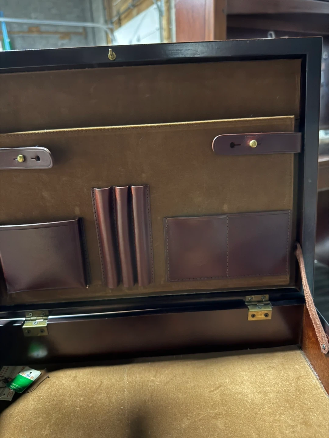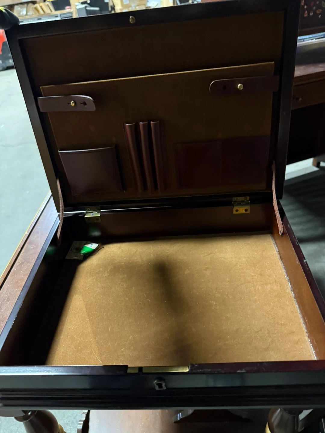 Selling a vintage wooden secretary suitcase It has a beautiful dark brown finish and a unique design. The desk features multiple compartments and slots for organizing your documents and stationery. Perfect for adding a touch of classic elegance to your home office!