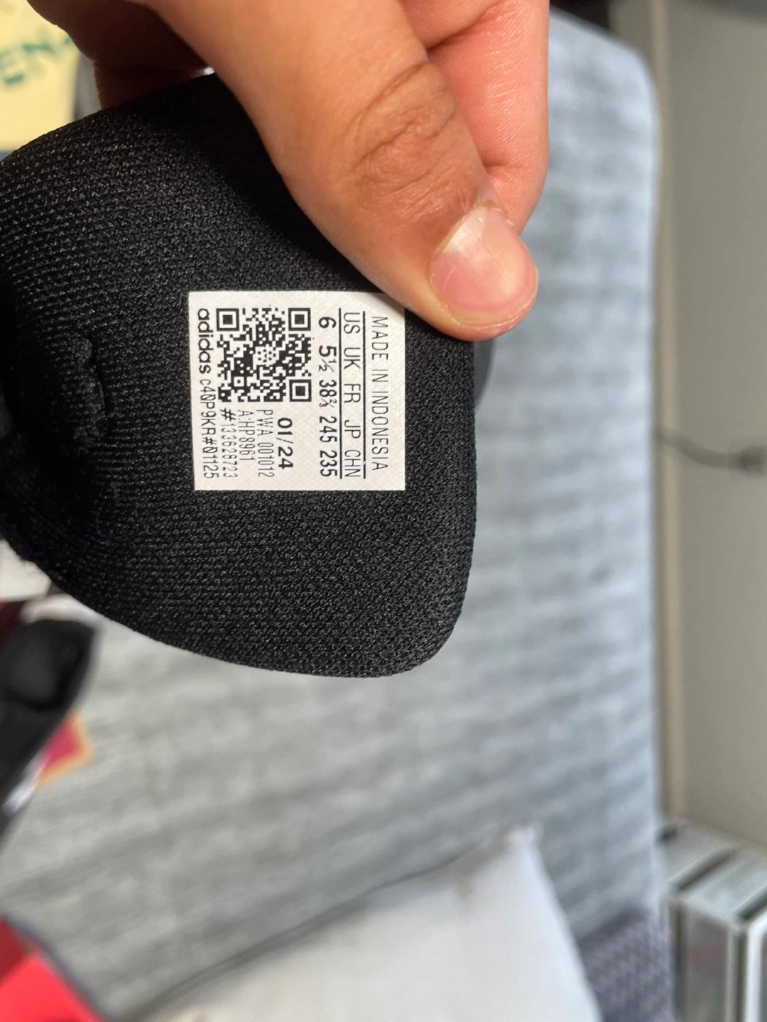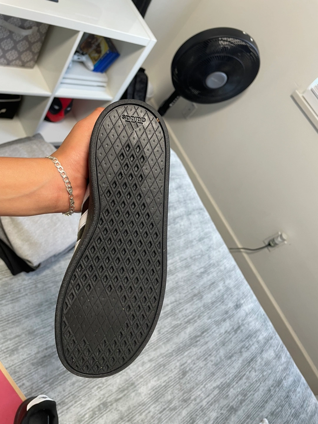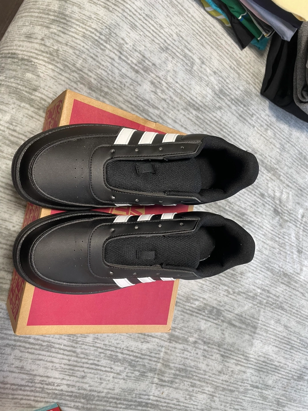 Selling a pair of Adidas Court Team Bounce shoes in size 6. They are black with white stripes and in great condition. The shoe size is US 6, UK 5.5, FR 38 2/3, JP 245, and CHN 235.