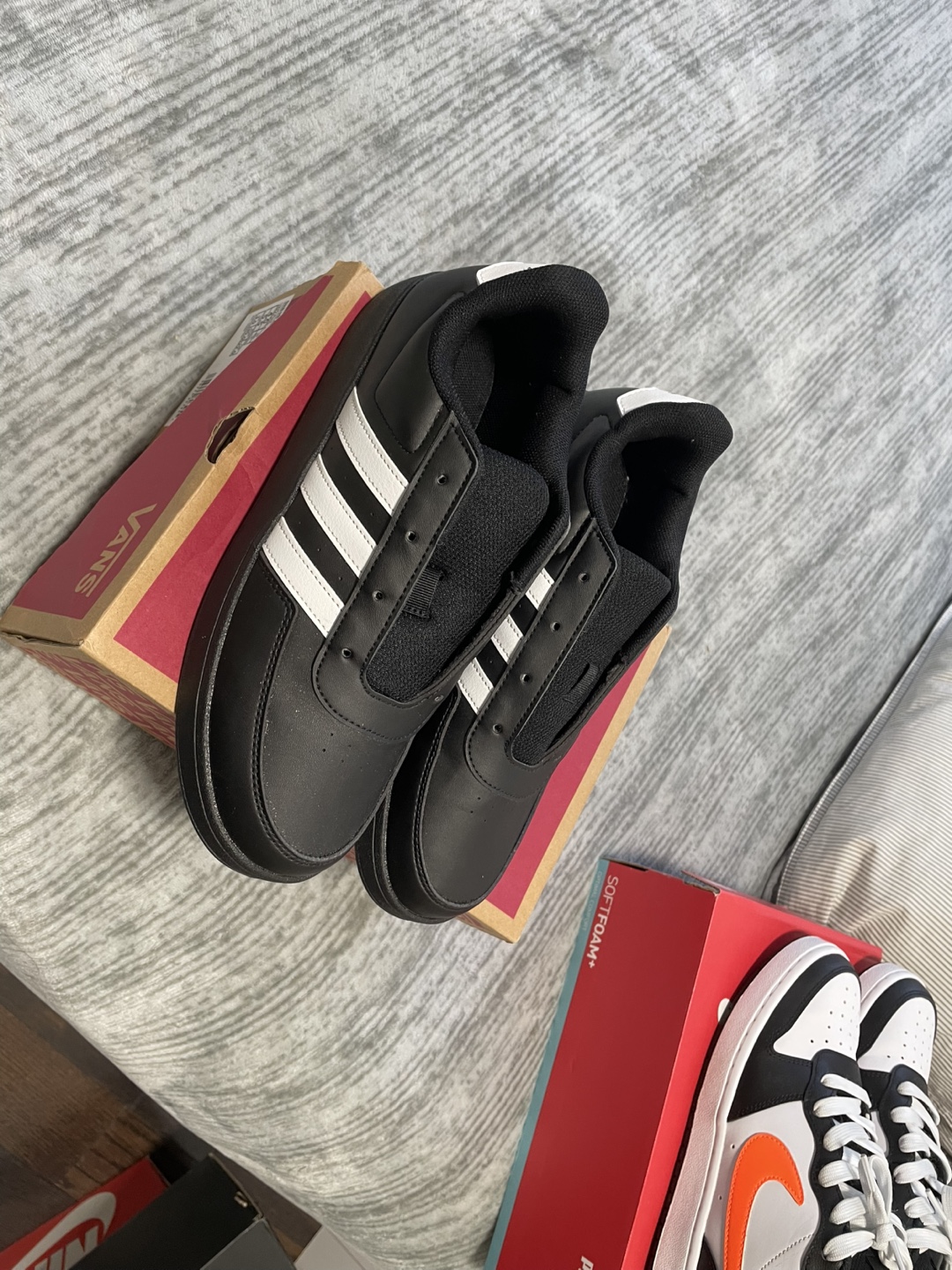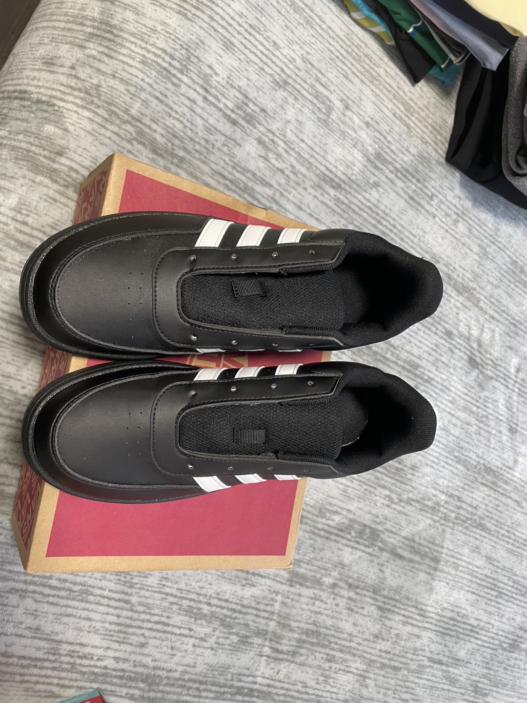 Selling a pair of Adidas Court Team Bounce shoes in size 6. They are black with white stripes and in great condition. The shoe size is US 6, UK 5.5, FR 38 2/3, JP 245, and CHN 235.
