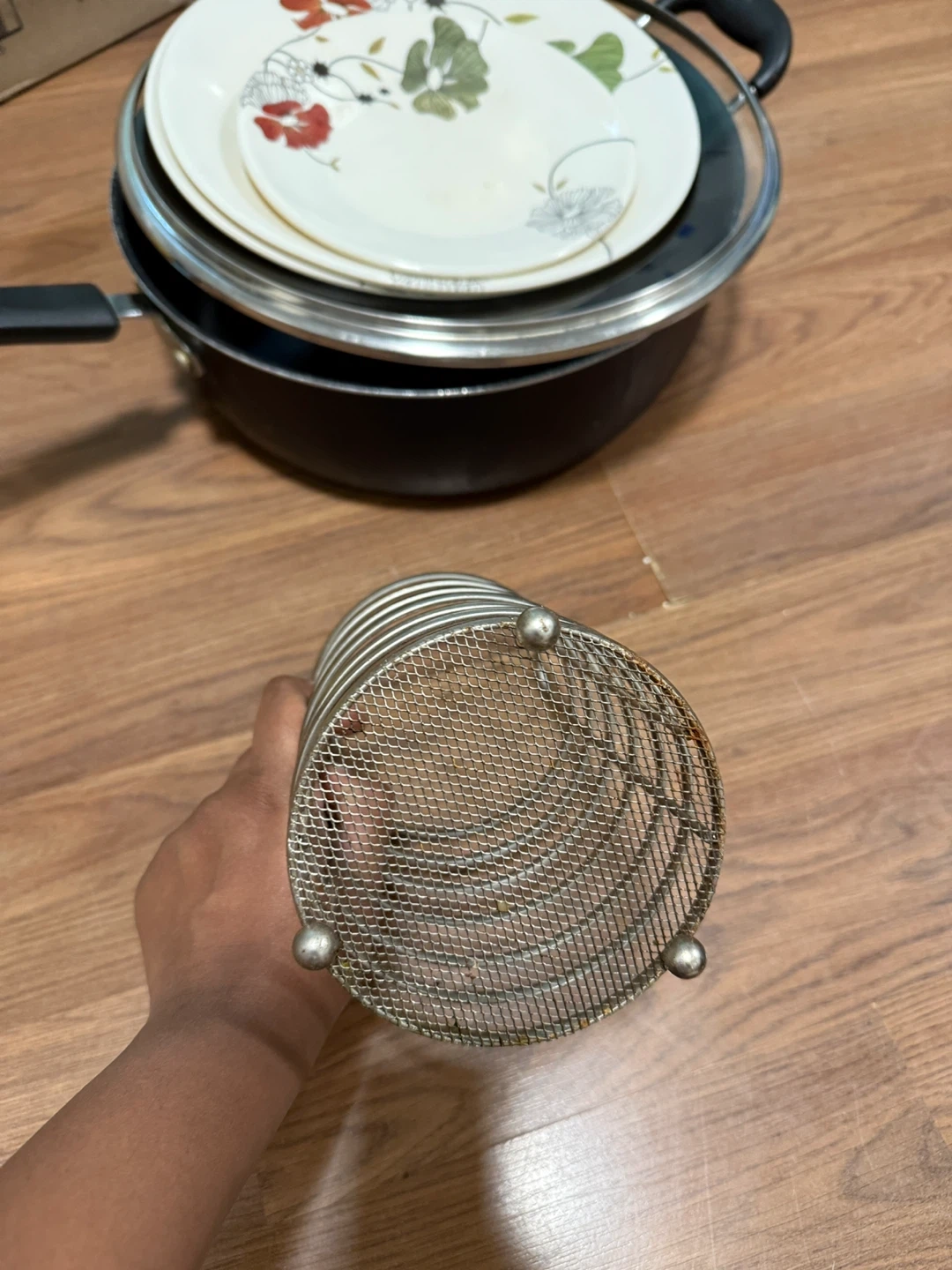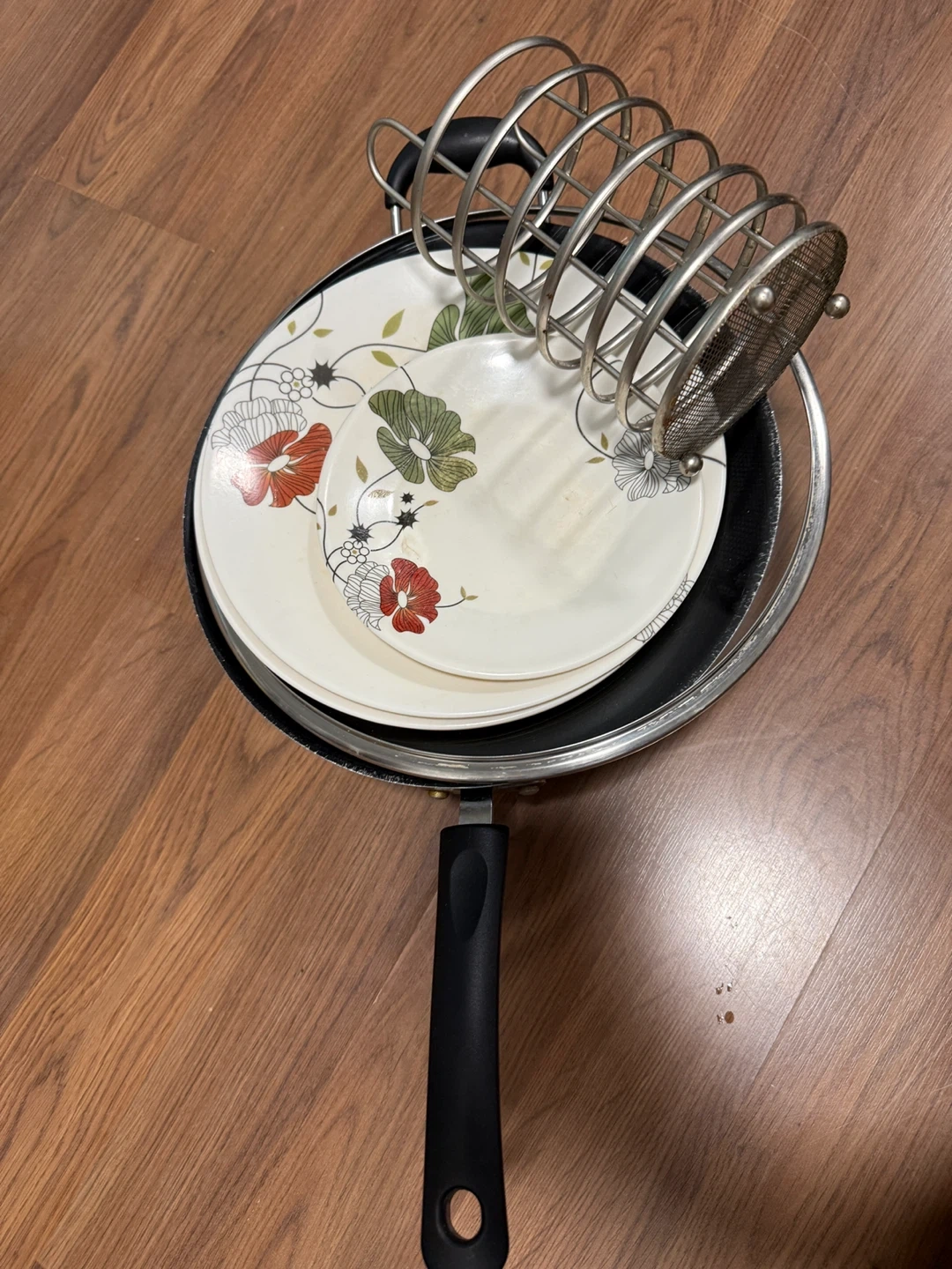 Selling a collection of kitchen items including pots, pans, plates with floral designs, and a metal utensil holder. They're used but still have plenty of life left!