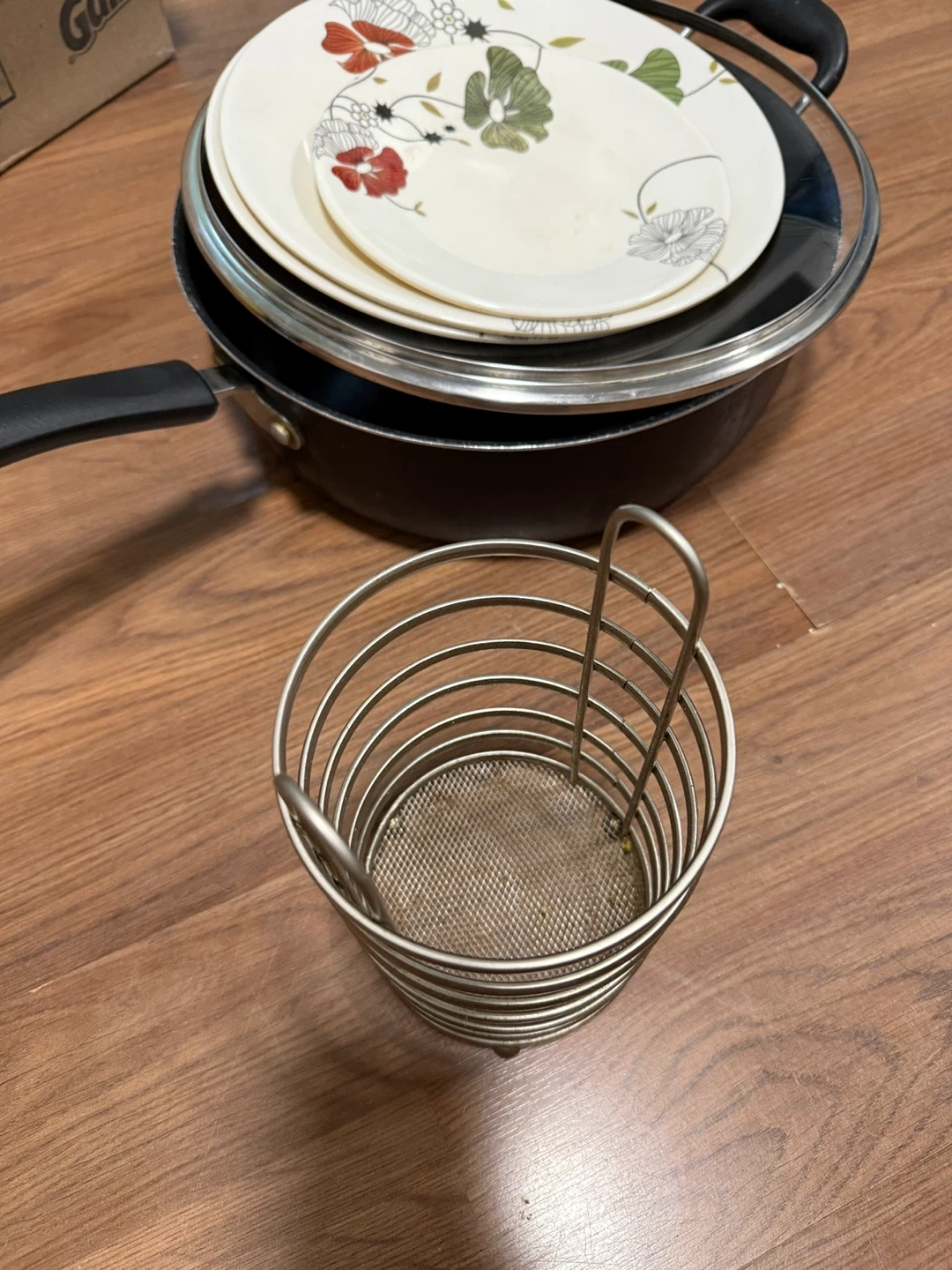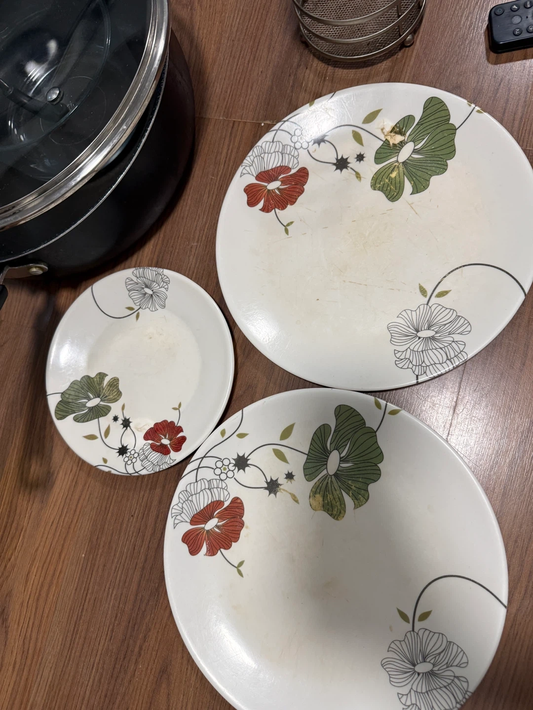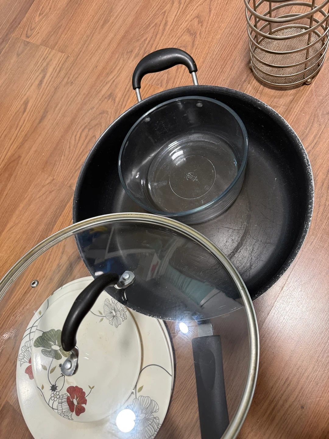 Selling a collection of kitchen items including pots, pans, plates with floral designs, and a metal utensil holder. They're used but still have plenty of life left!