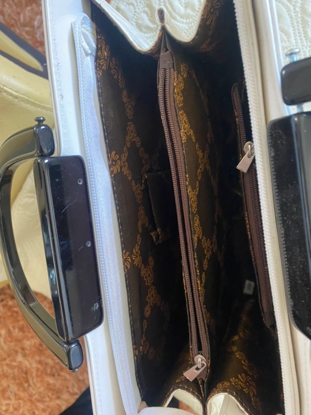 This white patent handbag features sleek black handles. It has a zippered main compartment and interior pockets. A stylish accessory for any occasion!