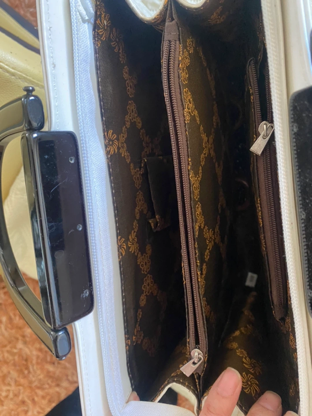 This white patent handbag features sleek black handles. It has a zippered main compartment and interior pockets. A stylish accessory for any occasion!
