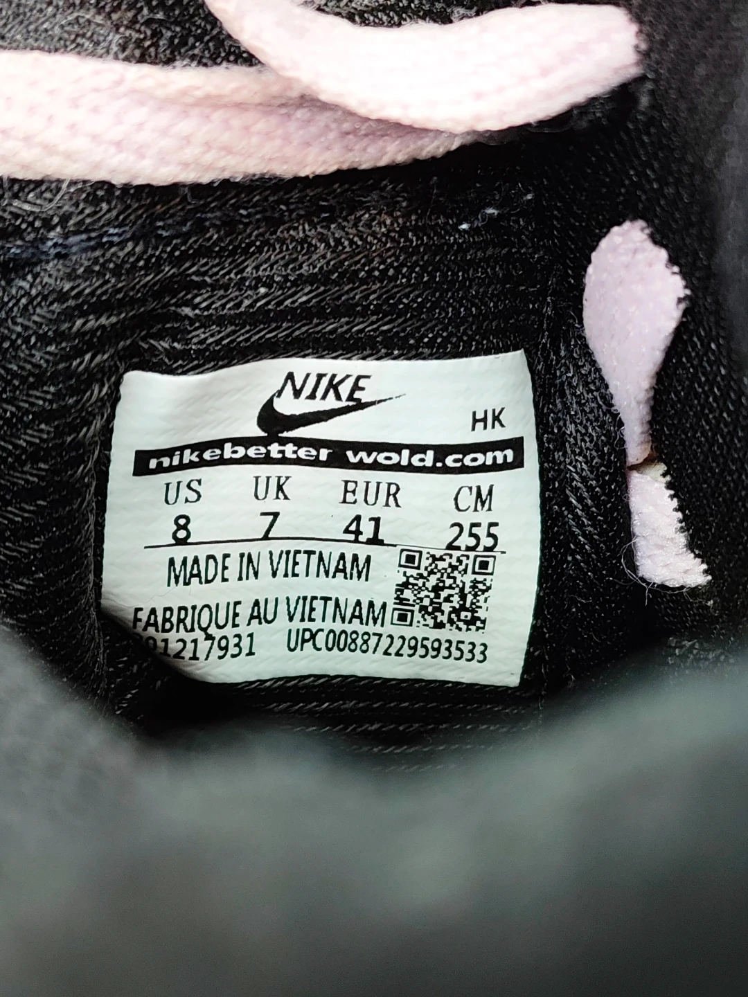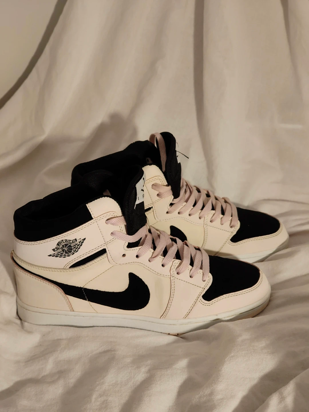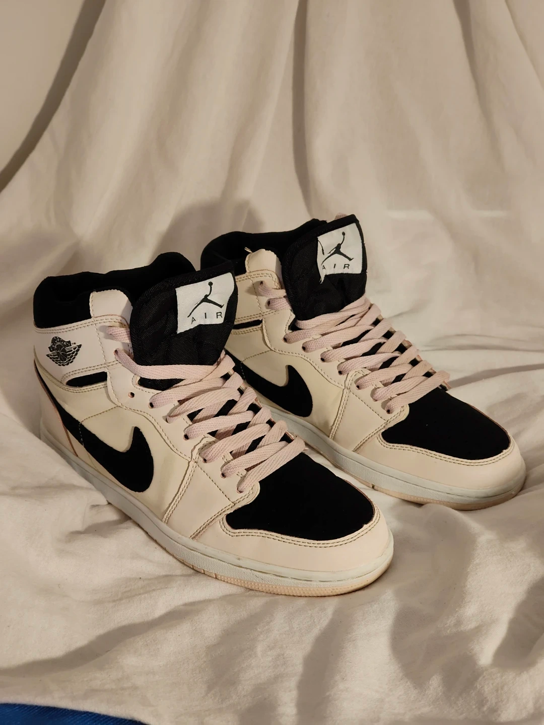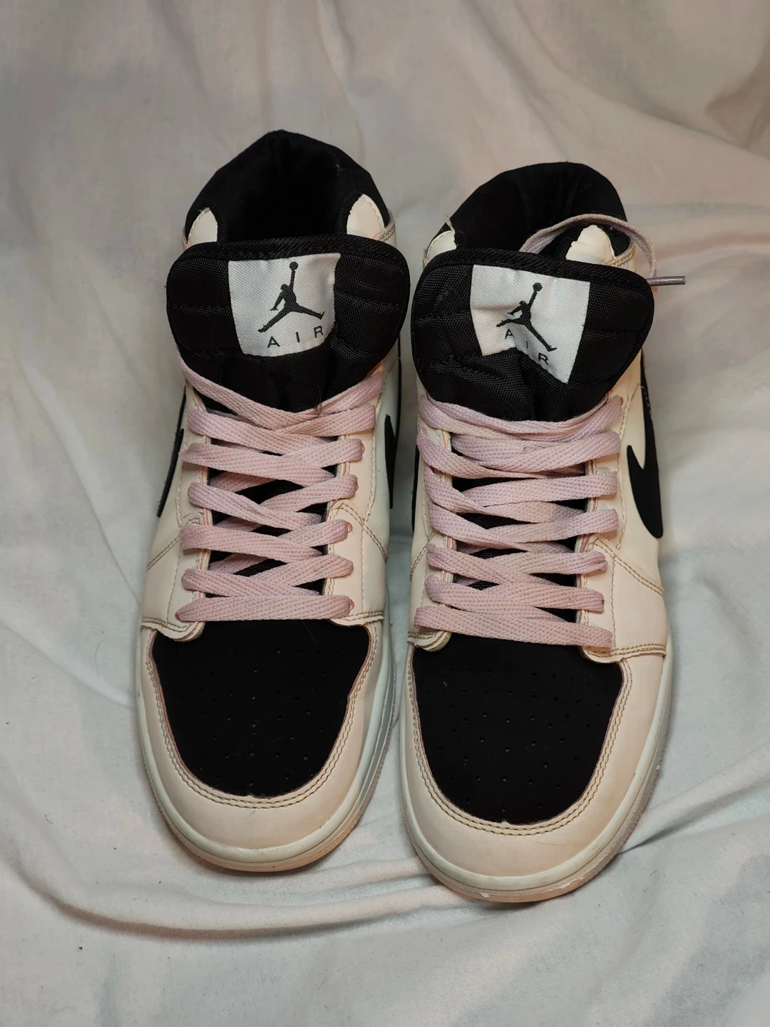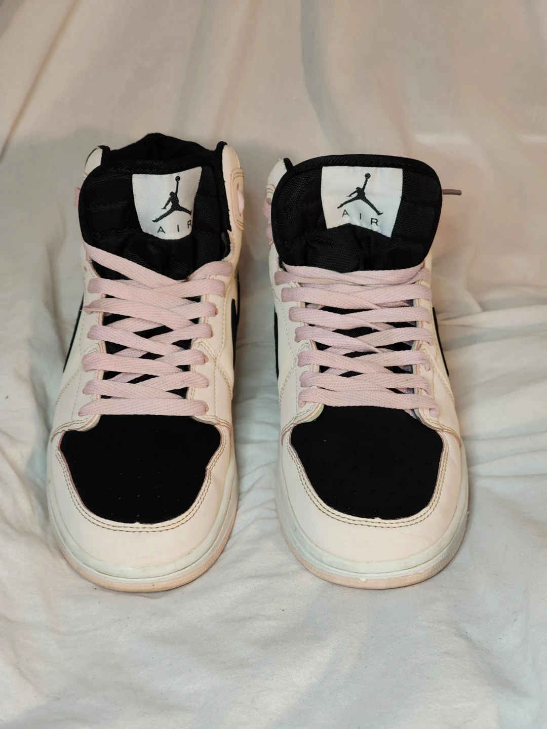 Selling a pair of Nike Air Jordan 1 Mid SE sneakers. The size is US 8. They feature a black and cream colourway with pink laces. Great for everyday wear!