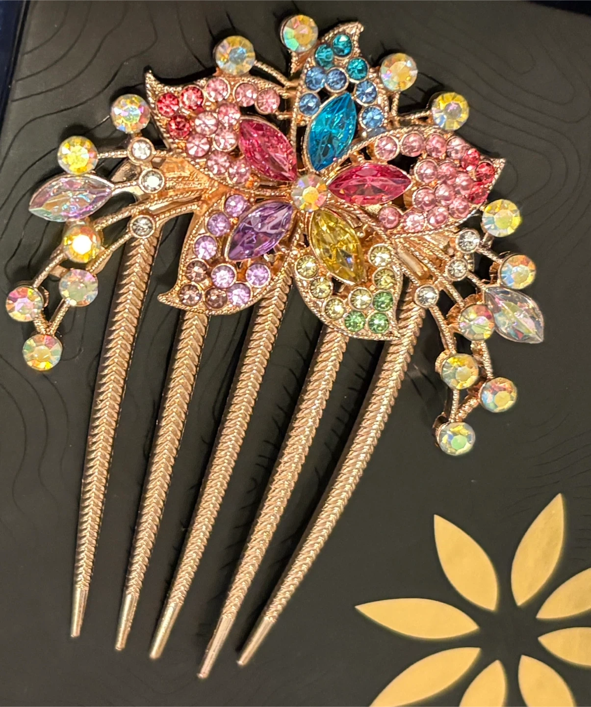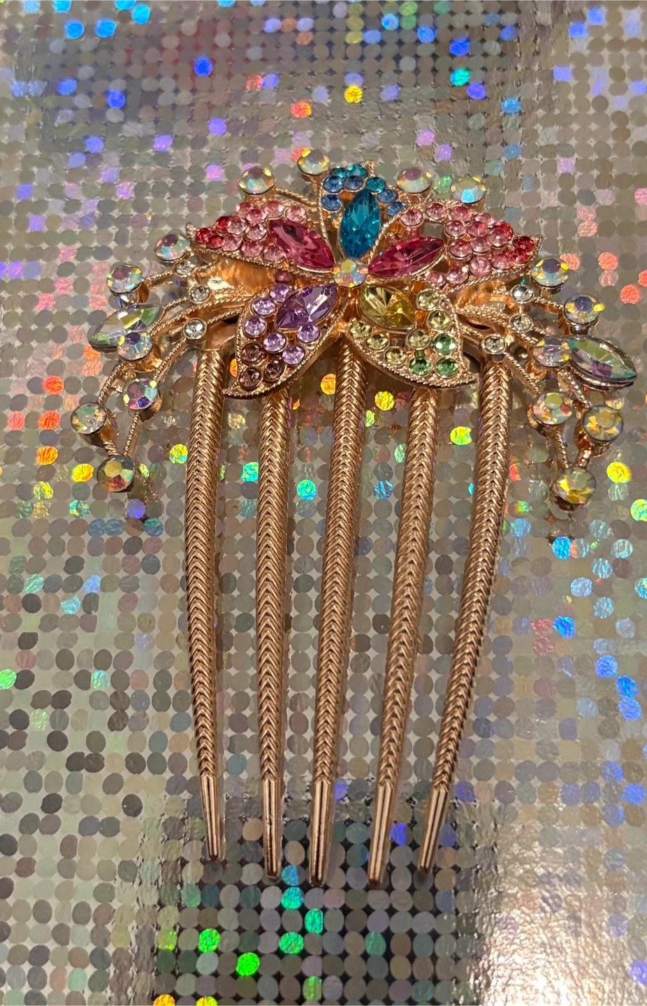 Gorgeous hair comb adorned with colourful rhinestones in a floral design. It's a beautiful accessory for special occasions or to add some sparkle to your everyday look!