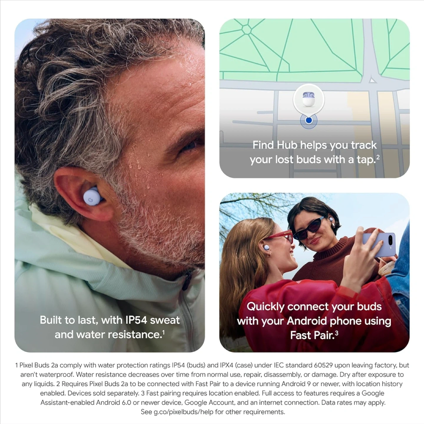 Pixel Buds 2a are built for lightweight comfort and an impeccable fit; secure them during workouts or commutes with the twist-to-adjust stabilizer, or twist the other direction for relaxed comfort.
