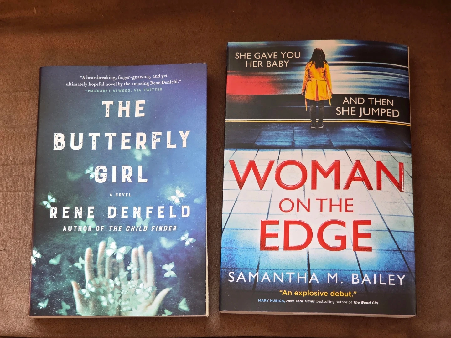 Two gripping novels for thriller fans. 'The Butterfly Girl' by Rene Denfeld is a haunting mystery. 'Woman on the Edge' by Samantha M. Bailey is an explosive debut. Both paperbacks offer suspenseful reads.