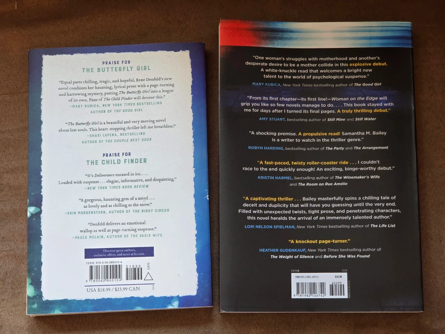 Two gripping novels for thriller fans. 'The Butterfly Girl' by Rene Denfeld is a haunting mystery. 'Woman on the Edge' by Samantha M. Bailey is an explosive debut. Both paperbacks offer suspenseful reads.