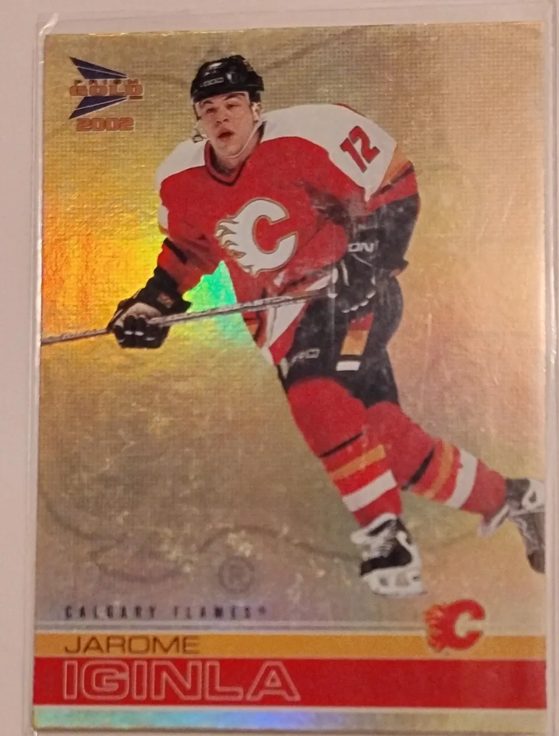 This is a 2002 Pacific Prism hockey card featuring Jarome Iginla of the Calgary Flames. It's a trading card. Includes player stats and bio on the back.