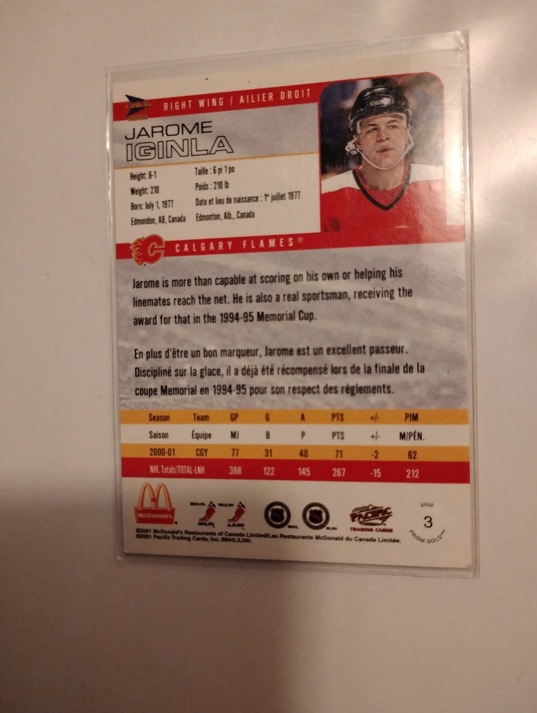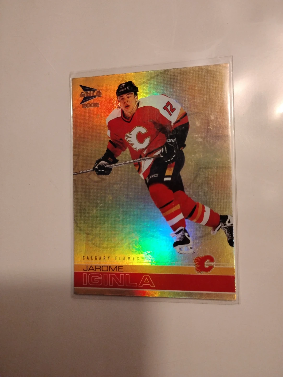 This is a 2002 Pacific Prism hockey card featuring Jarome Iginla of the Calgary Flames. It's a trading card. Includes player stats and bio on the back.