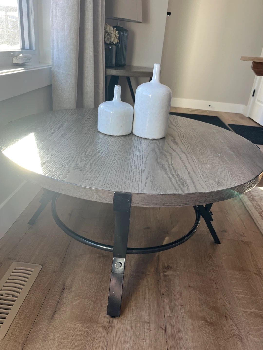 A round coffee table with a wood-look top. It has a metal base and legs. This table's natural tone complements many decor styles.