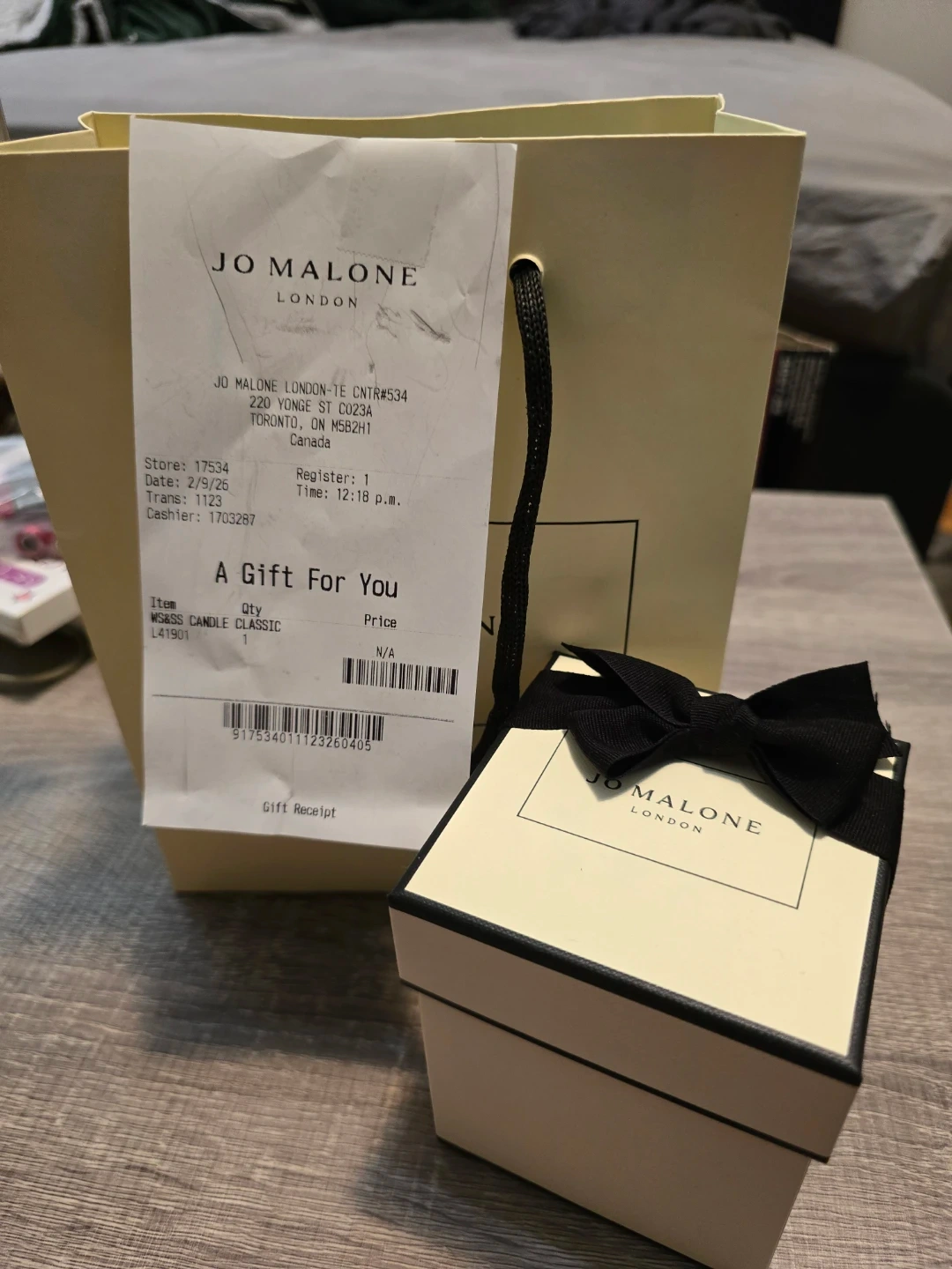 Jo Malone London Wood Sage & Sea Salt Classic Candle. It's in a glass container with a silver lid, tied with a black ribbon. Includes original packaging.