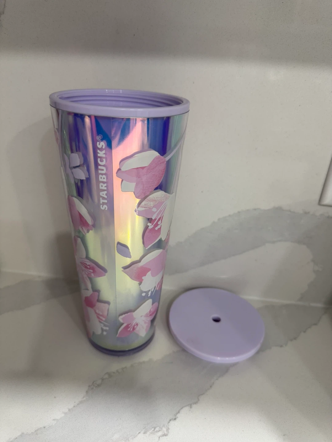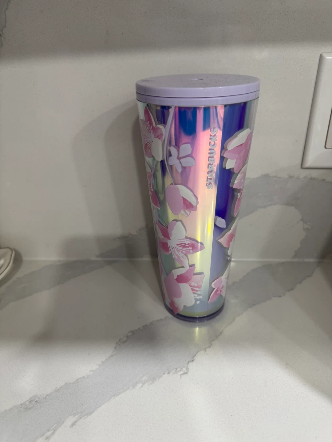 This Starbucks tumbler features a beautiful iridescent design with pink and white flowers. It has a capacity of roughly 24 ounces and measures approximately 9 inches tall. Includes a lavender lid.
