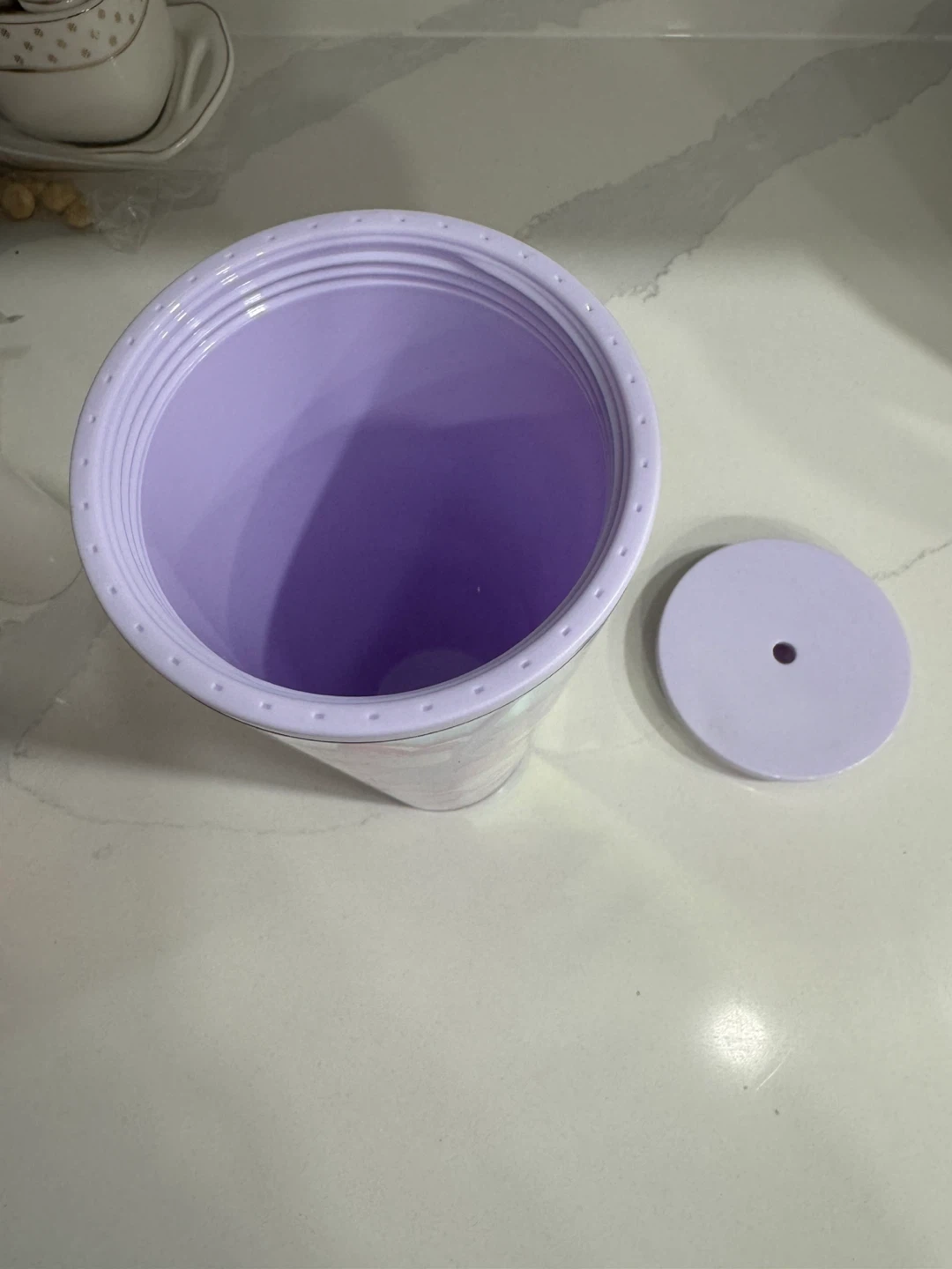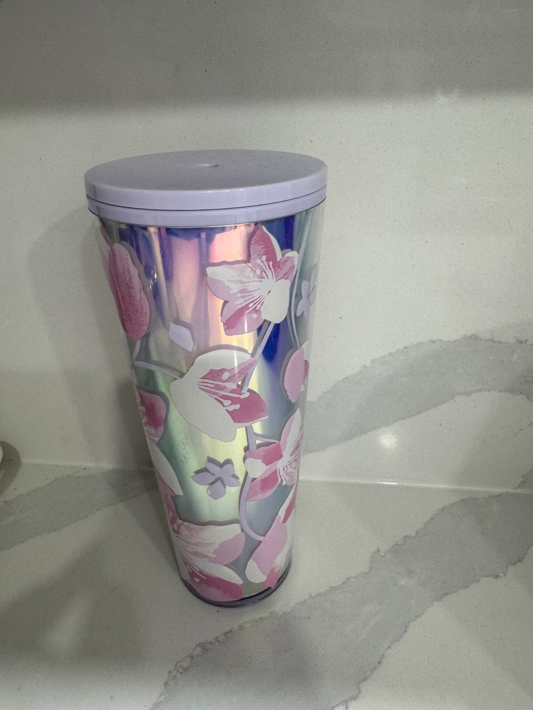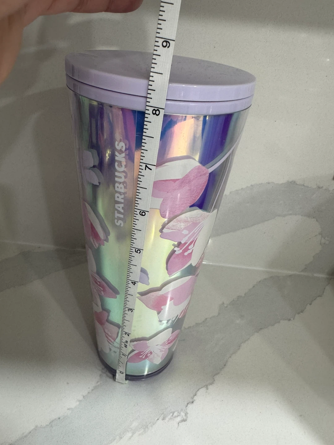 This Starbucks tumbler features a beautiful iridescent design with pink and white flowers. It has a capacity of roughly 24 ounces and measures approximately 9 inches tall. Includes a lavender lid.