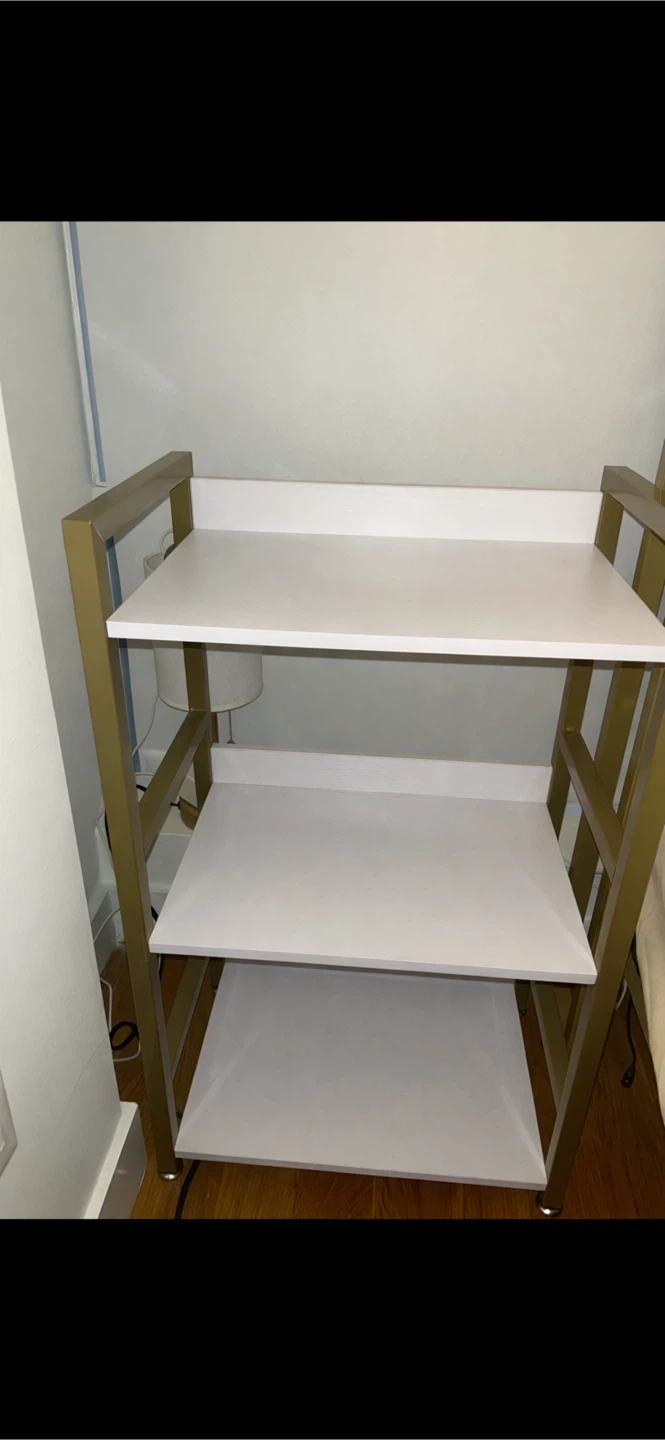 This is a 3-tier nightstand with white shelves and gold-tone metal framing. It's a versatile piece for storage or display.