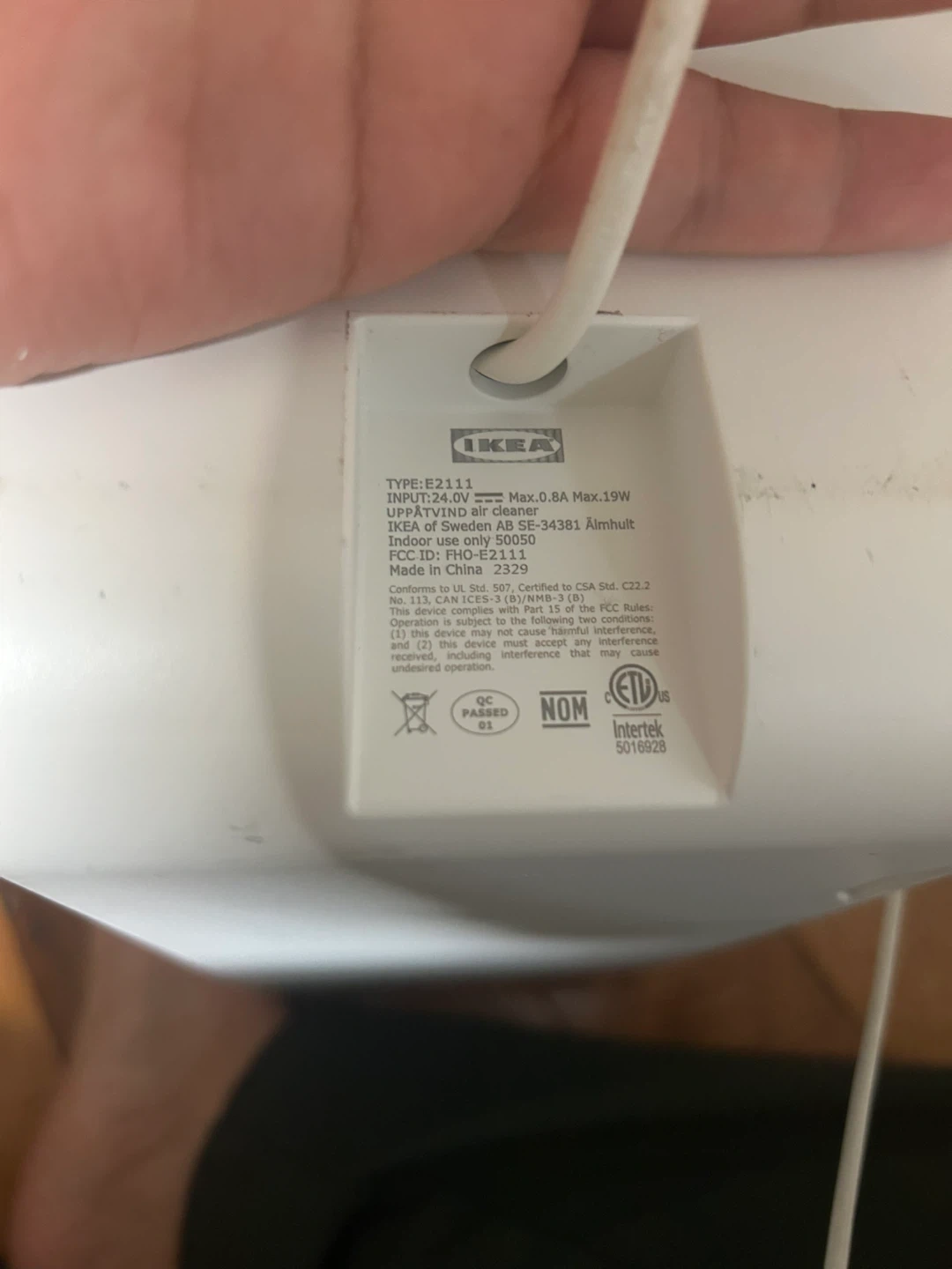 IKEA UPPSIKT air purifier. Model E2113. It's white and designed for indoor use only. Made in China. The filter have to change the new one. But the machine still can working