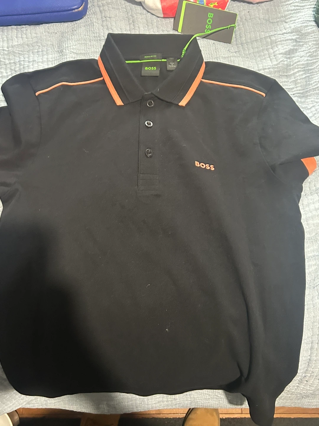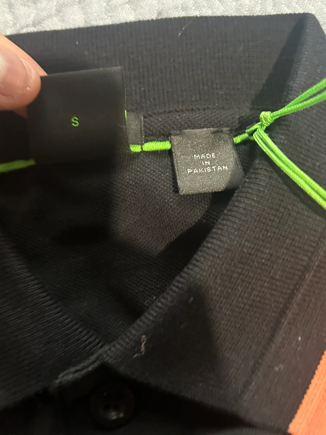Hugo Boss black polo shirt in size small! It features an orange trim and is in great condition. Made in Pakistan.