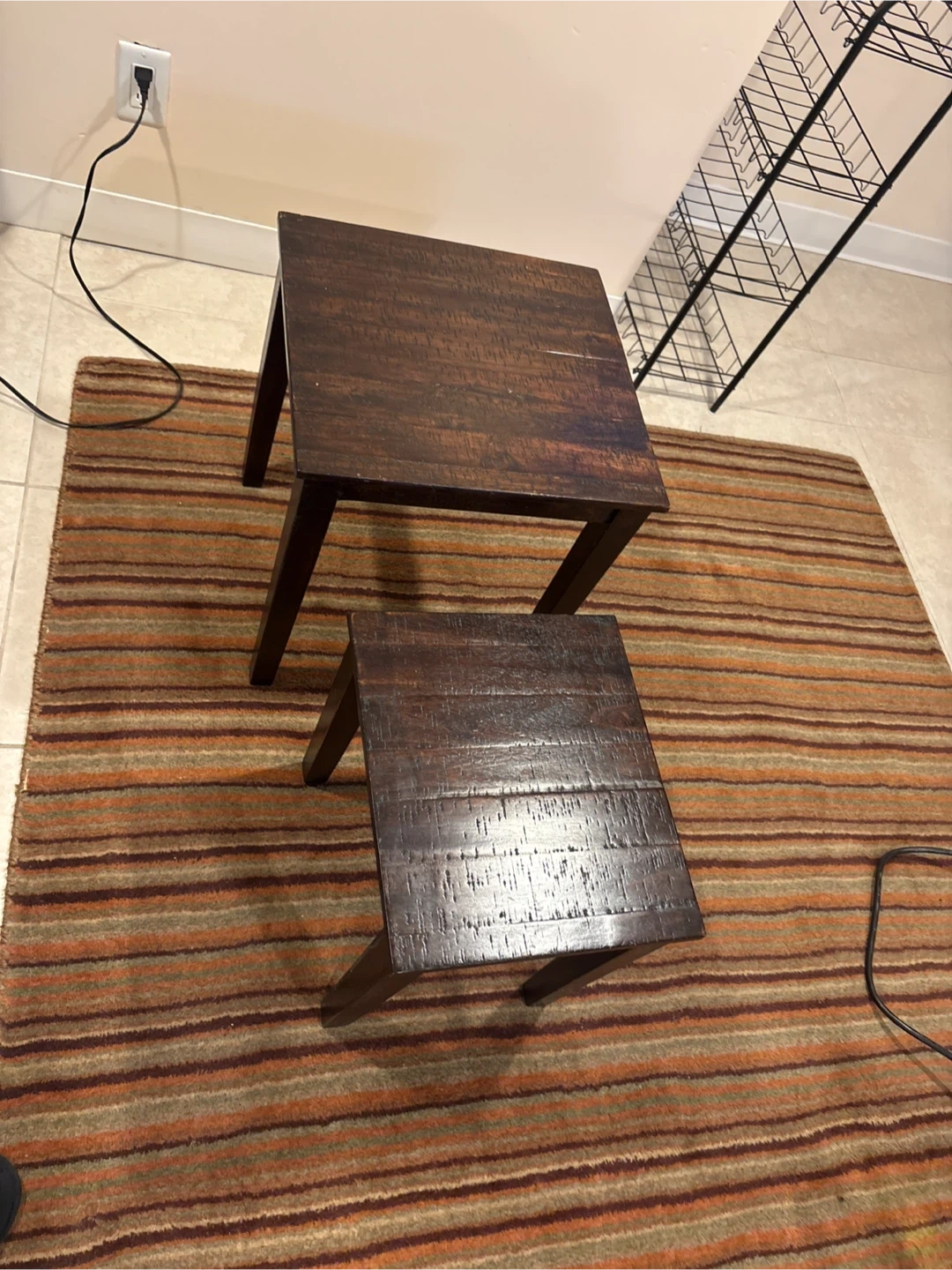 A set of two dark wood nesting tables. These tables have a rustic distressed finish and a space-saving design. The larger table measures approximately 20" tall and the smaller table fits underneath.