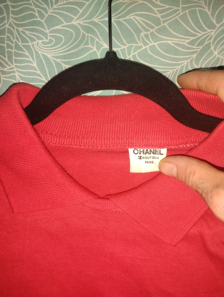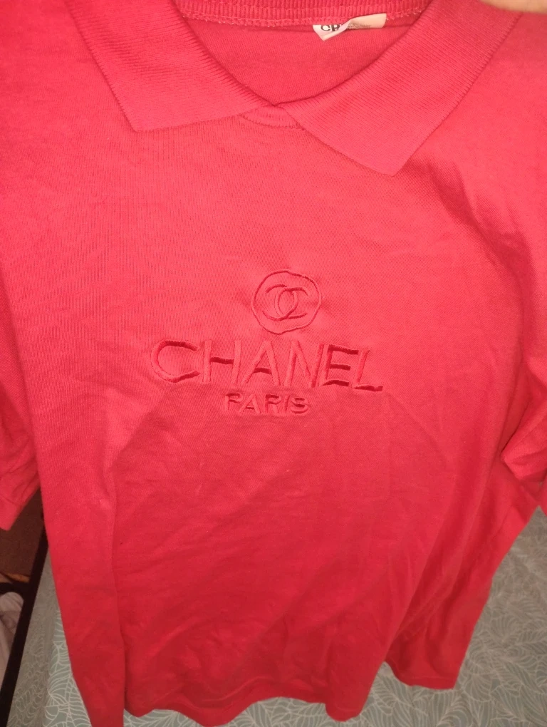 A classic red polo shirt from Chanel Paris! It's in great condition and features the iconic Chanel logo. Perfect for adding a touch of luxury to your wardrobe