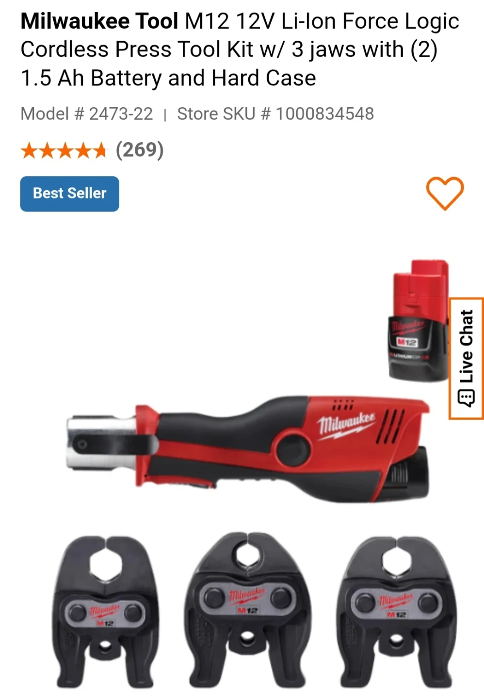The Milwaukee M12 FORCE LOGIC Press Tool Kit with Jaws is the lightest press tool on the market and represents a new level in portability and accessibility around installed pipe. The M12 press tool features a one-handed, in-line design enabling users to operate the tool nearly anywhere they can fit your arm. Built-in REDLINK technology enables the press tool to monitor the force output, delivering users with quality connections. A visual indicator alerts users when a secure connection has been achieved and when the tool needs calibration. The cordless press tool features the best calibration standards, only requiring service every 32,000 crimps. When used with Milwaukee's M12 FORCE LOGIC Press Jaws, this tool delivers quality press connections on all major fitting brands including Viega ProPress Systems, Elkhart APOLLOXPRESS and Grinnell G-Press copper systems. In addition to the press tool, this kit includes two M12 REDLITHIUM CP1.5 battery packs; 1/2 -inch, 3/4 -inch and 1 -inch M12 jaws
