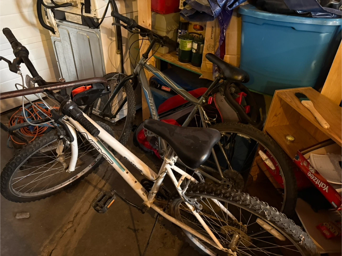 Selling two mountain bikes, one white and one grey/blue. Both have standard adult bike components and knobby tires for off-road use. They're good for cruising around the neighbourhood or hitting local trails. Perfect for anyone looking for a couple of reliable rides!