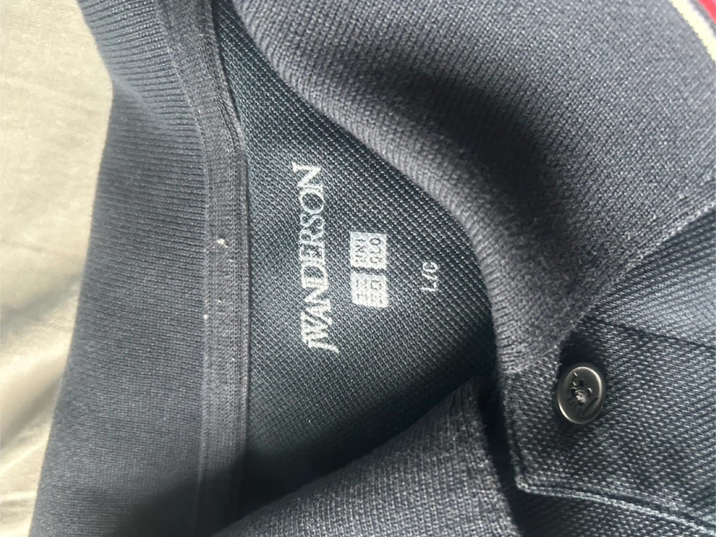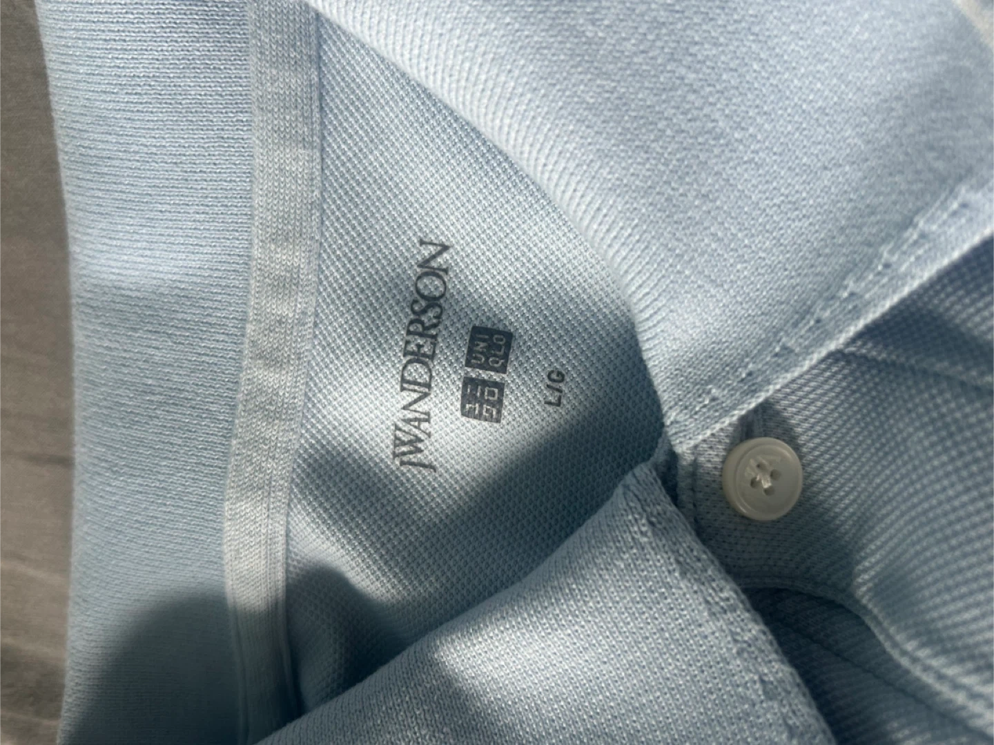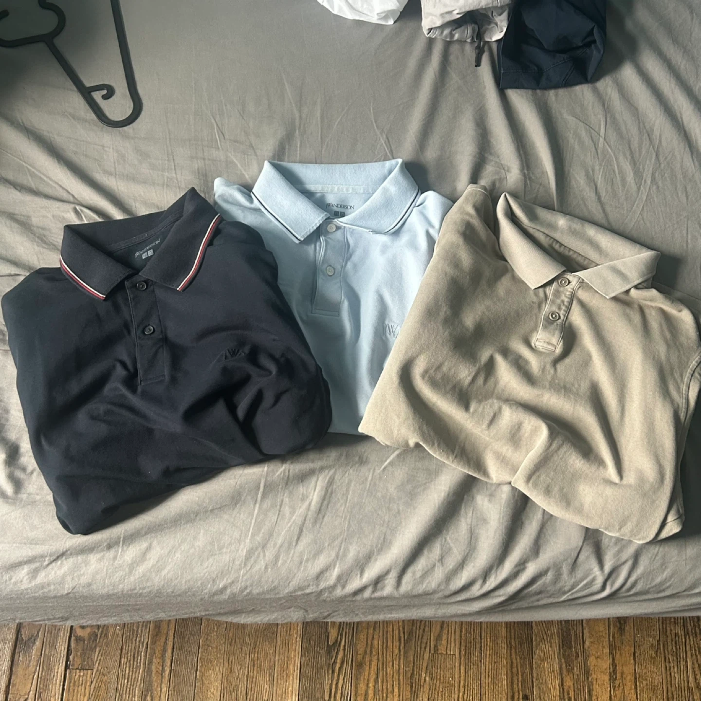 Three JW Anderson x Uniqlo polo shirts in size L. Includes navy, light blue, and a tan Lululemons Polo. Cotton blend fabric. These are great for everyday wear!
