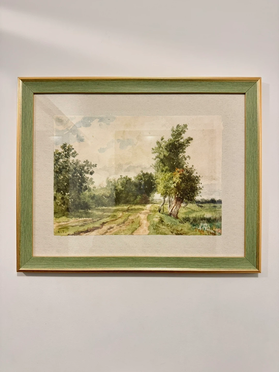 A charming watercolour painting depicting a rural landscape scene with a dirt path winding through trees. It's presented in a decorative green and gold frame with a linen mat. This piece would add a touch of nature to any room!