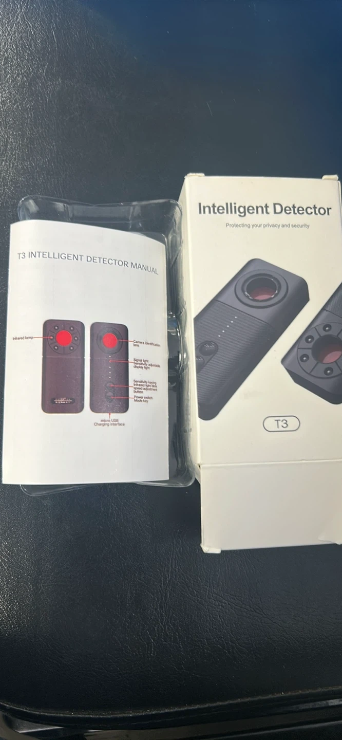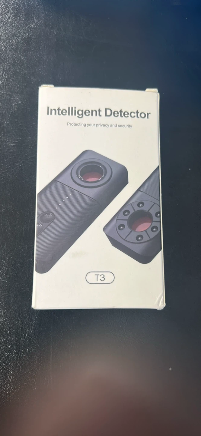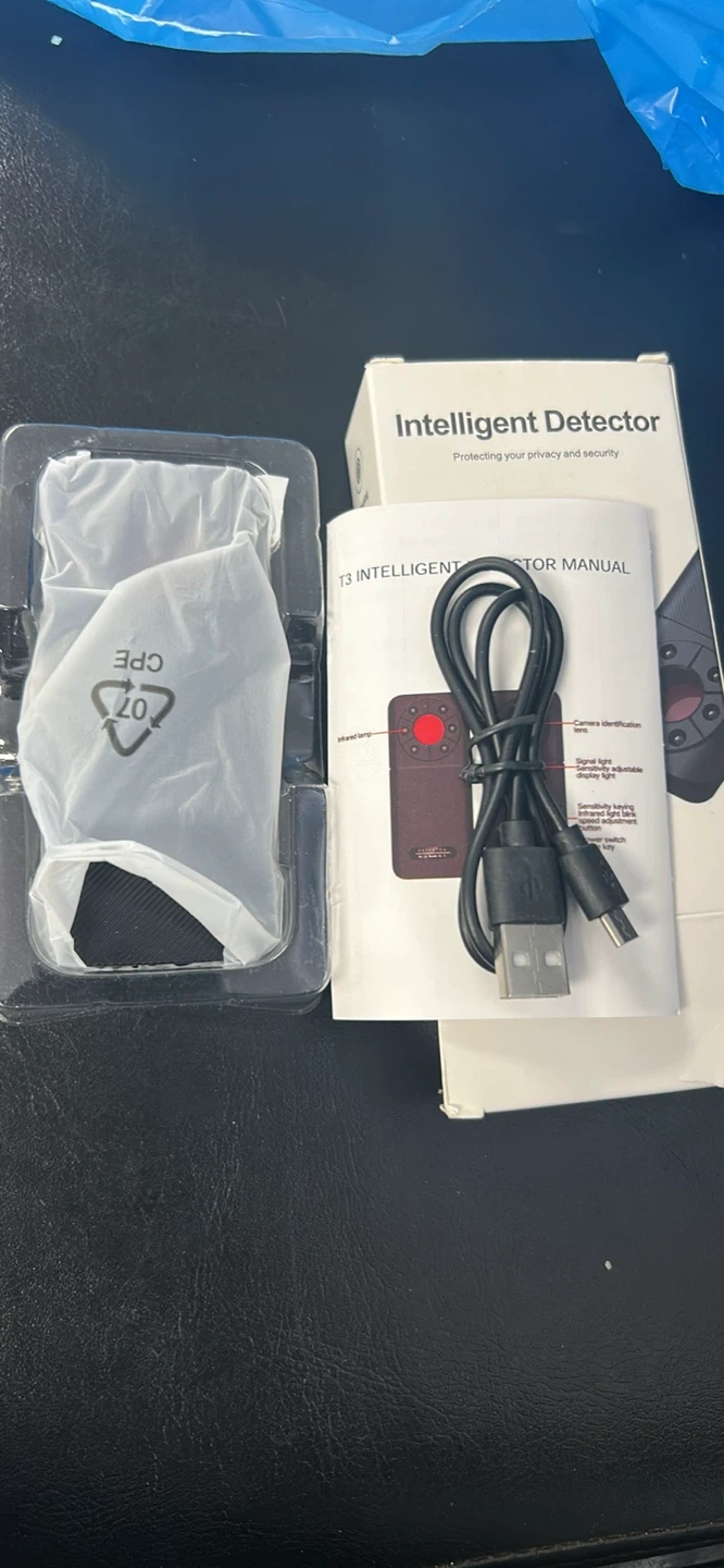 This is a T3 Intelligent Detector. It's designed for protecting your privacy and security. It includes the detector, a USB charging cable, and a manual.
