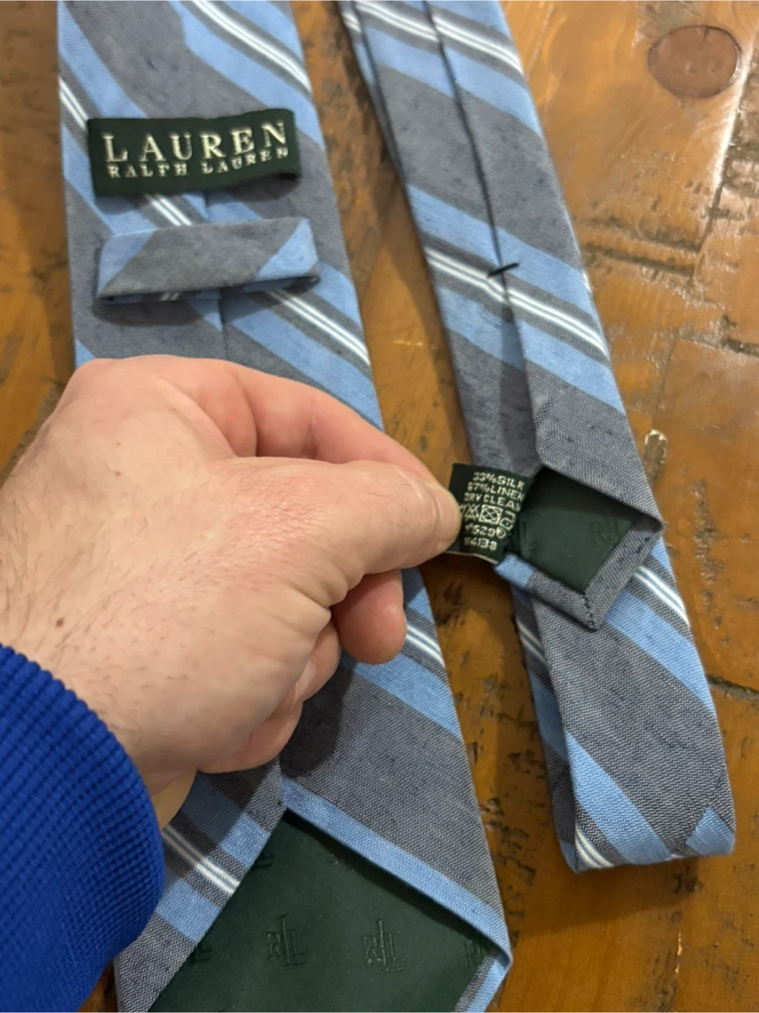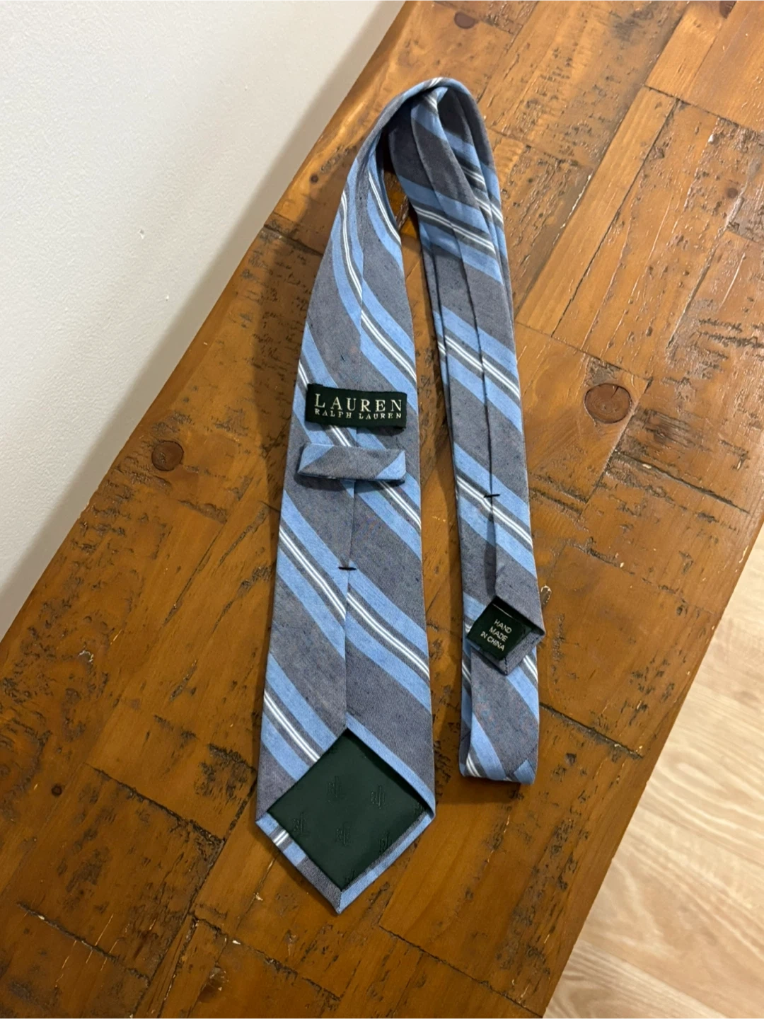 This is a Lauren Ralph Lauren tie featuring blue and grey stripes. It's made from a blend of silk, linen, and cotton. Perfect for smart casual or business attire!