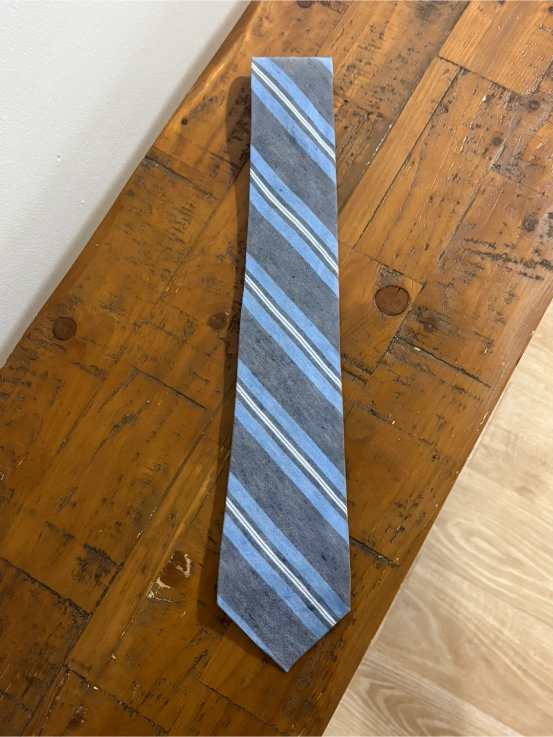 This is a Lauren Ralph Lauren tie featuring blue and grey stripes. It's made from a blend of silk, linen, and cotton. Perfect for smart casual or business attire!