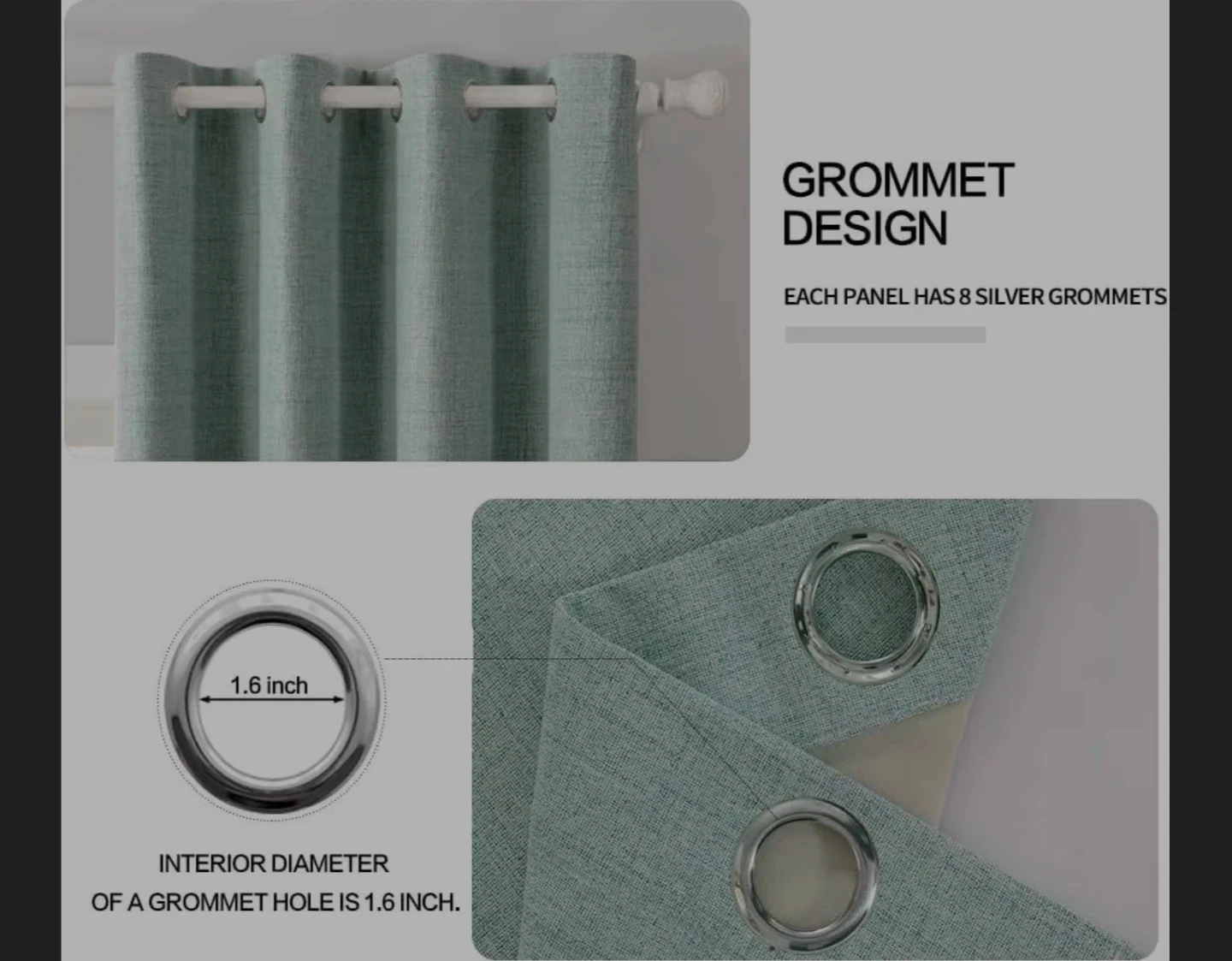 These MIULEE curtains are 100% blackout and made from faux linen fabric. Each panel has 8 silver grommets with an interior diameter of 1.6 inches. They help impede UV rays and reduce noise.