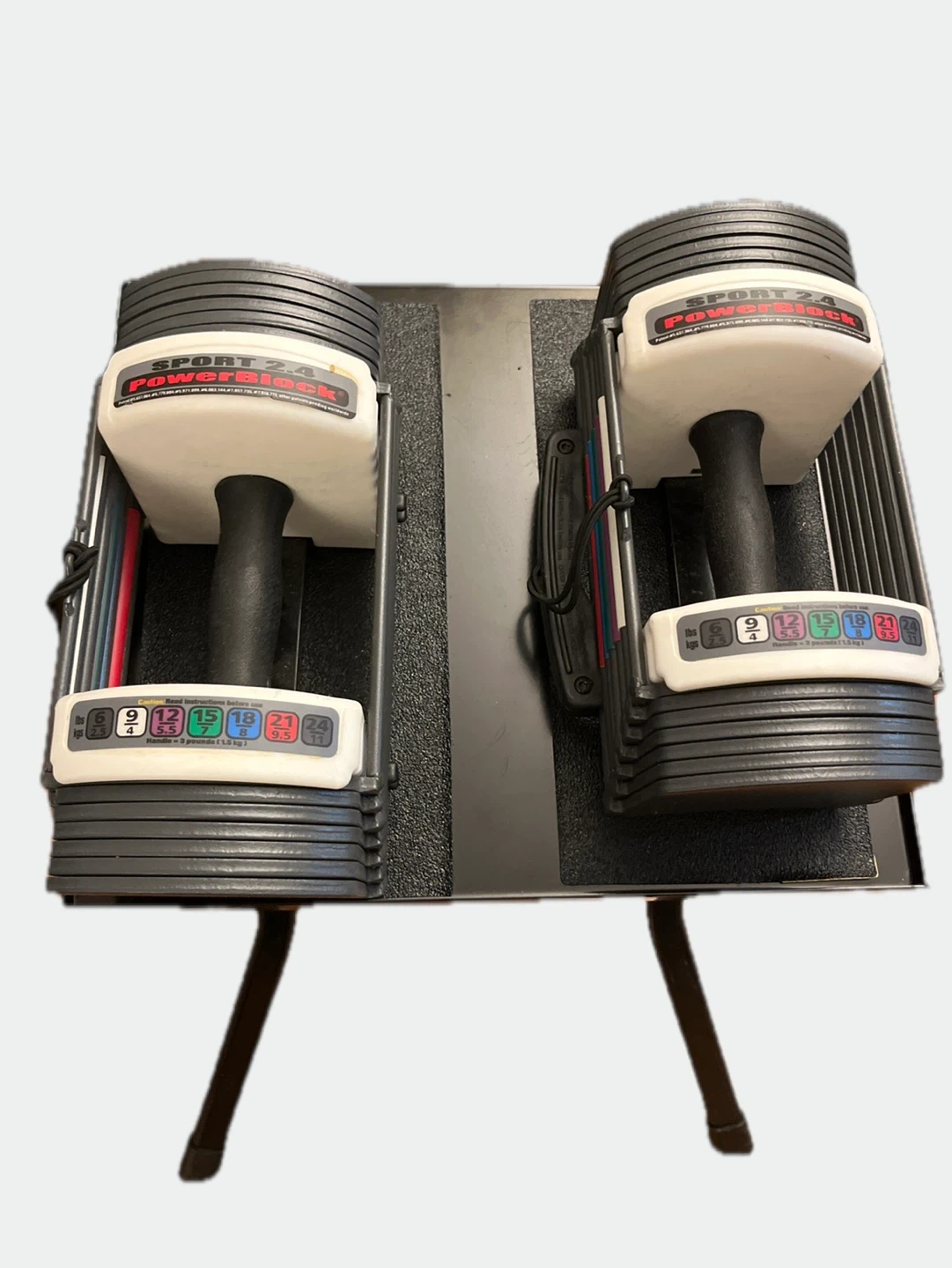 PowerBlock Sport 24 adjustable dumbbells. Weight changes from 5-24 lbs in 2.5 lb increments. Offers multiple weight sets in one compact design. Comes with folding stand.