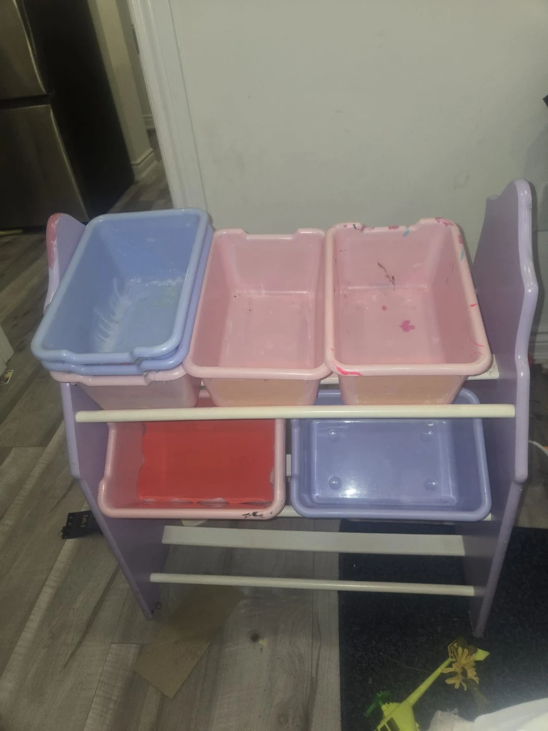 This handy toy organizer features a fun castle design with multiple bins for storing toys. It's perfect for keeping a child's room tidy! The bins are made of plastic and come in various colours. Dimensions are approximately 2.5 feet tall.