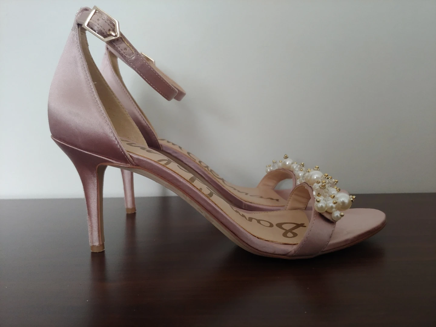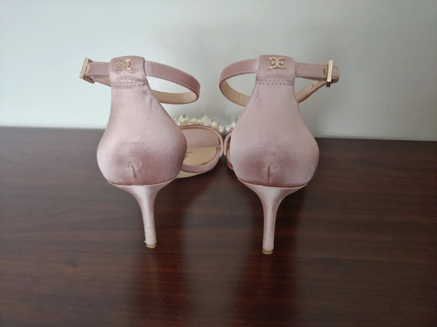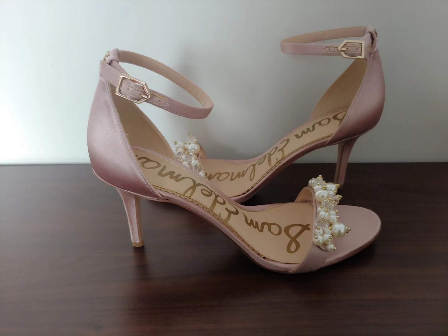 Gorgeous Sam Edelman heels in a rose gold satin finish. Features delicate pearl and bead embellishments on the toe strap. These elegant sandals have an adjustable ankle strap for a secure fit. I wore these for about 2 hours on my wedding. I never wear heels but these are remarkably comfortable. They look beautiful, and are in very good condition, just some wear on the heel only, as shown in photo.