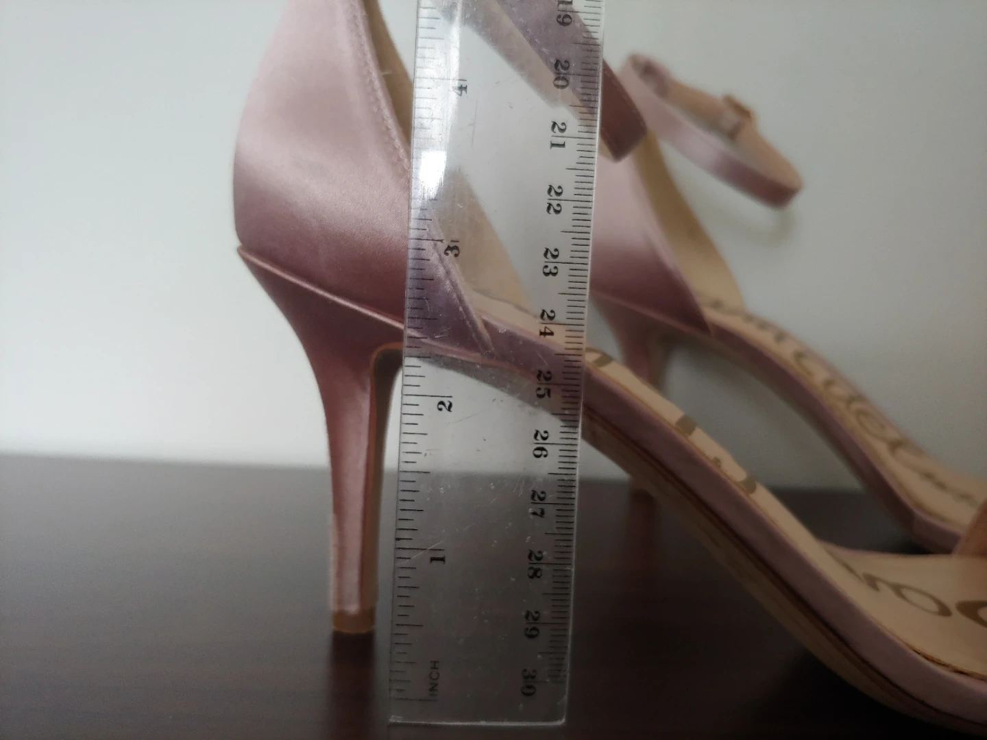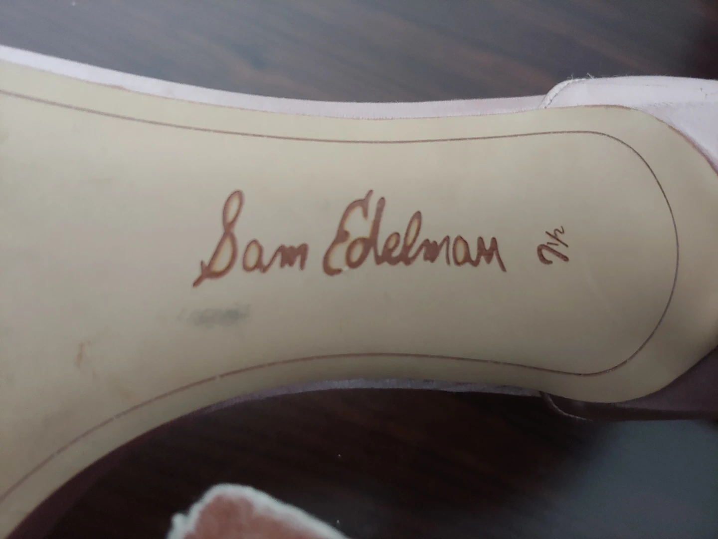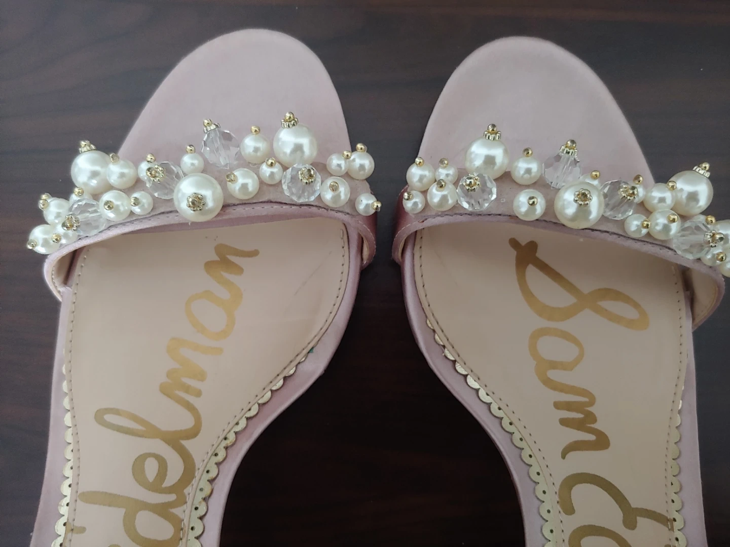 Gorgeous Sam Edelman heels in a rose gold satin finish. Features delicate pearl and bead embellishments on the toe strap. These elegant sandals have an adjustable ankle strap for a secure fit. I wore these for about 2 hours on my wedding. I never wear heels but these are remarkably comfortable. They look beautiful, and are in very good condition, just some wear on the heel only, as shown in photo.