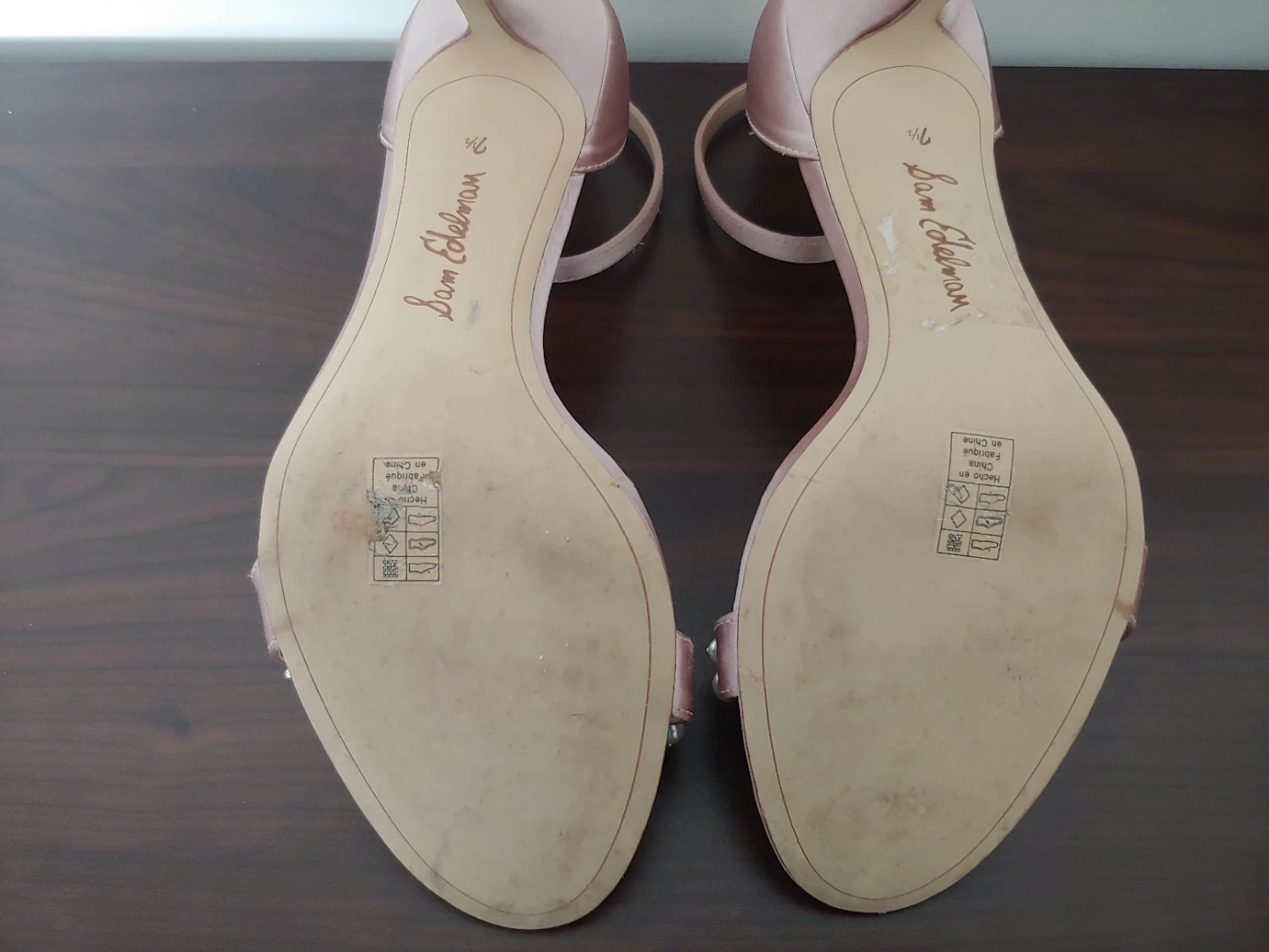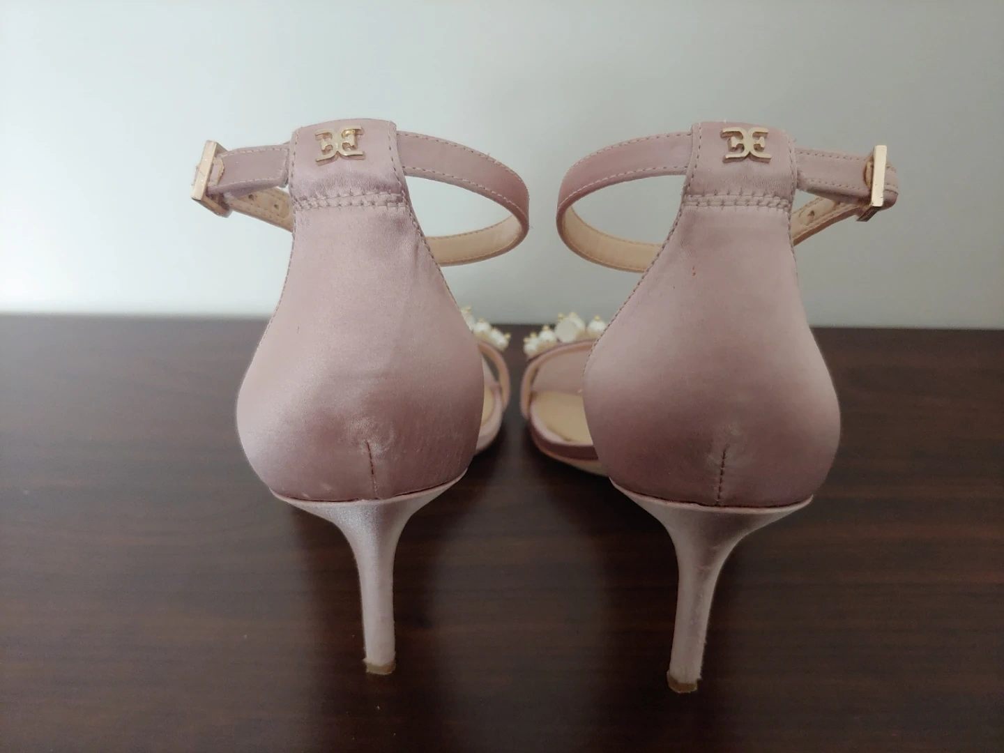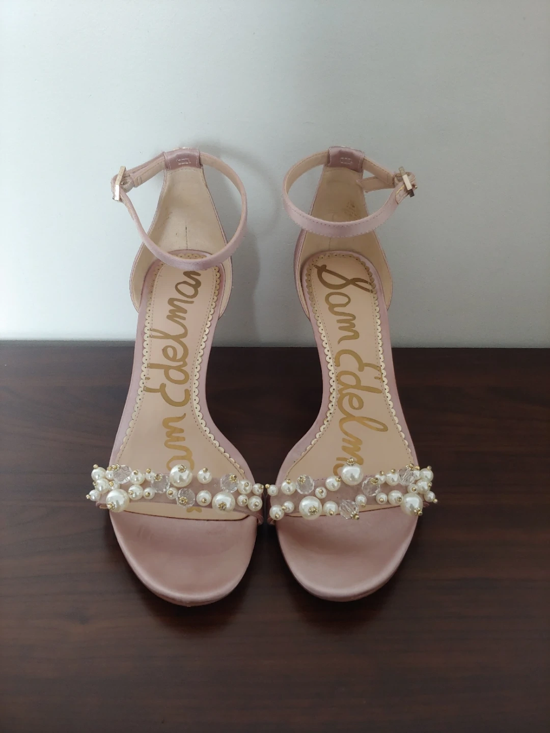 Gorgeous Sam Edelman heels in a rose gold satin finish. Features delicate pearl and bead embellishments on the toe strap. These elegant sandals have an adjustable ankle strap for a secure fit. I wore these for about 2 hours on my wedding. I never wear heels but these are remarkably comfortable. They look beautiful, and are in very good condition, just some wear on the heel only, as shown in photo.