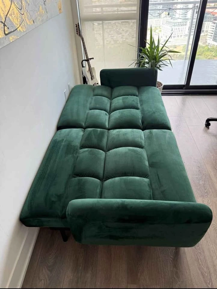 Selling a modern emerald green velvet sofa in excellent condition. Gently used, no damage. Perfect for a stylish living room or guest space. Comfortable seating and soft upholstery. Easily converts into a spacious bed. Elegant velvet fabric with sturdy black metal legs. Modern and practical design.