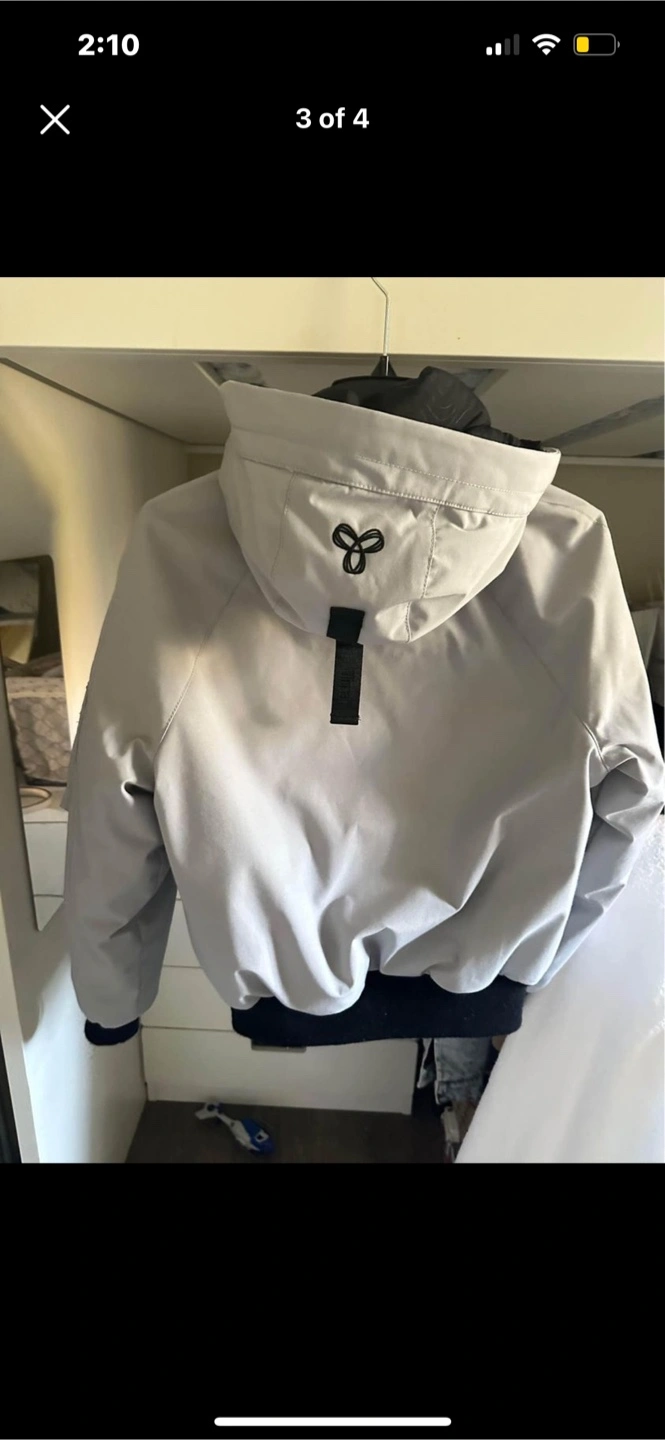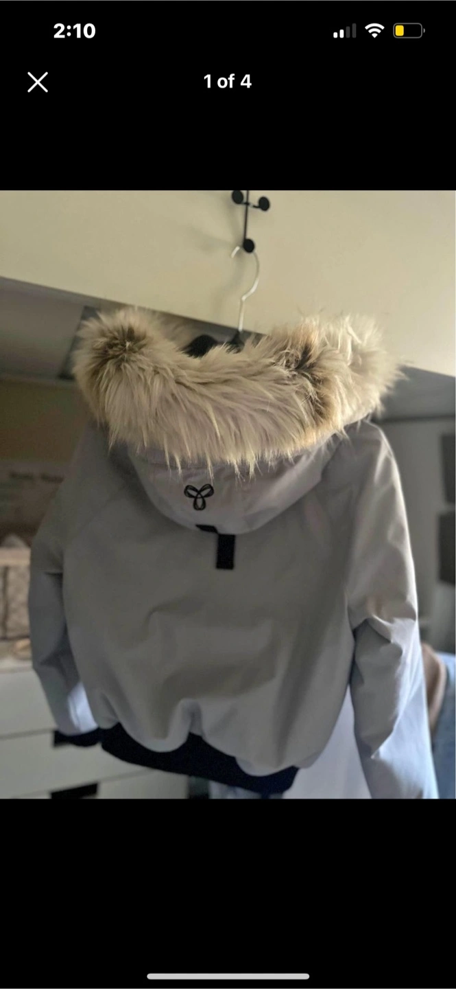Women's light grey tna bomber jacket. Features a faux fur lined hood. Excellent condition. Size Large.