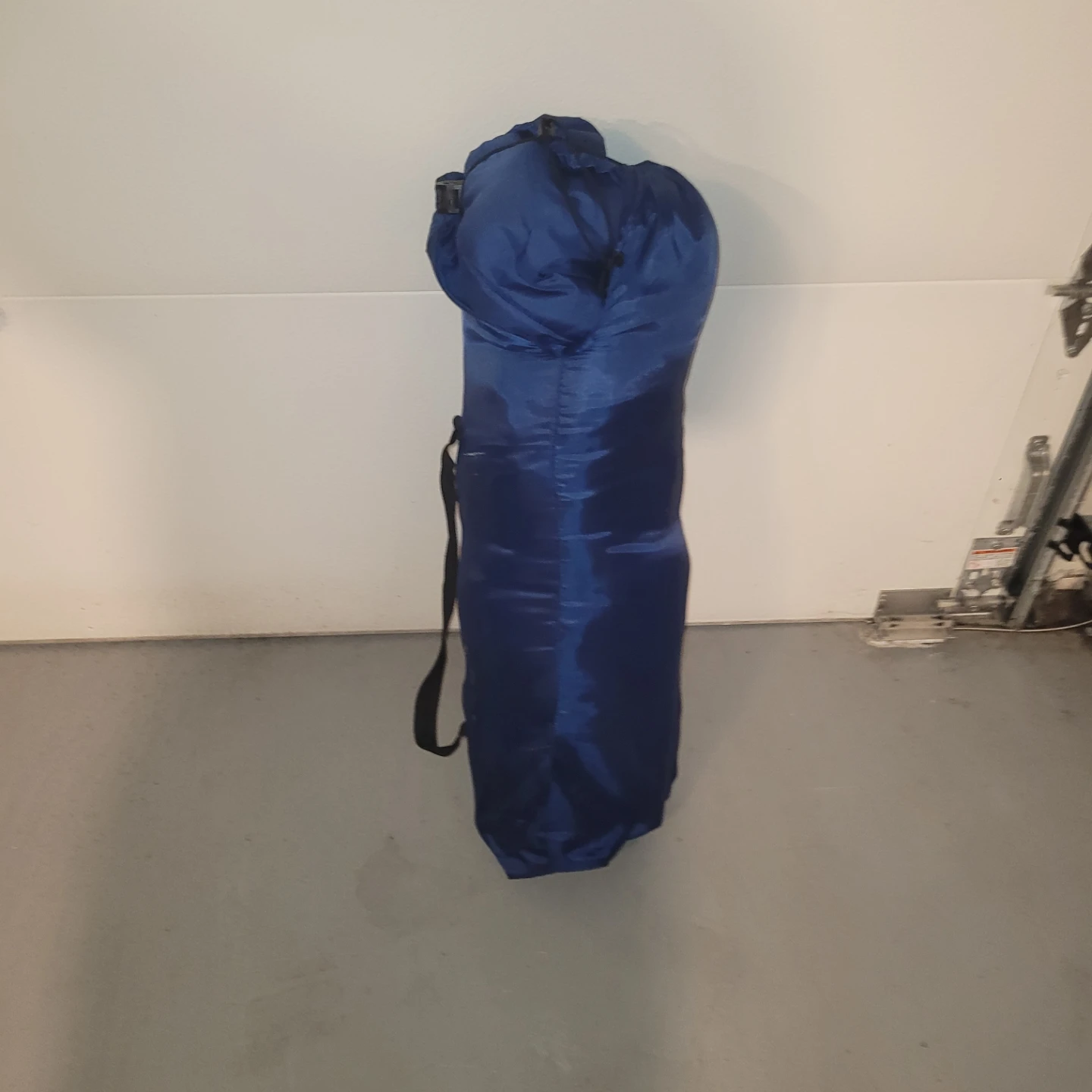 This is a blue camping cot with an attached sleeping bag. It's made with a durable fabric and a metal frame. Includes a carrying bag for portability. Perfect for camping trips or sleepovers!