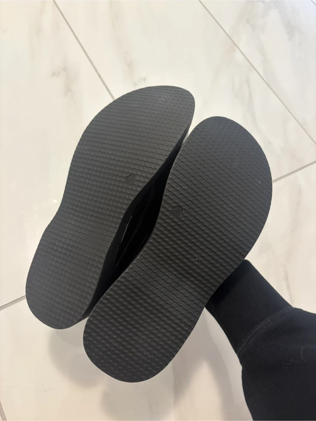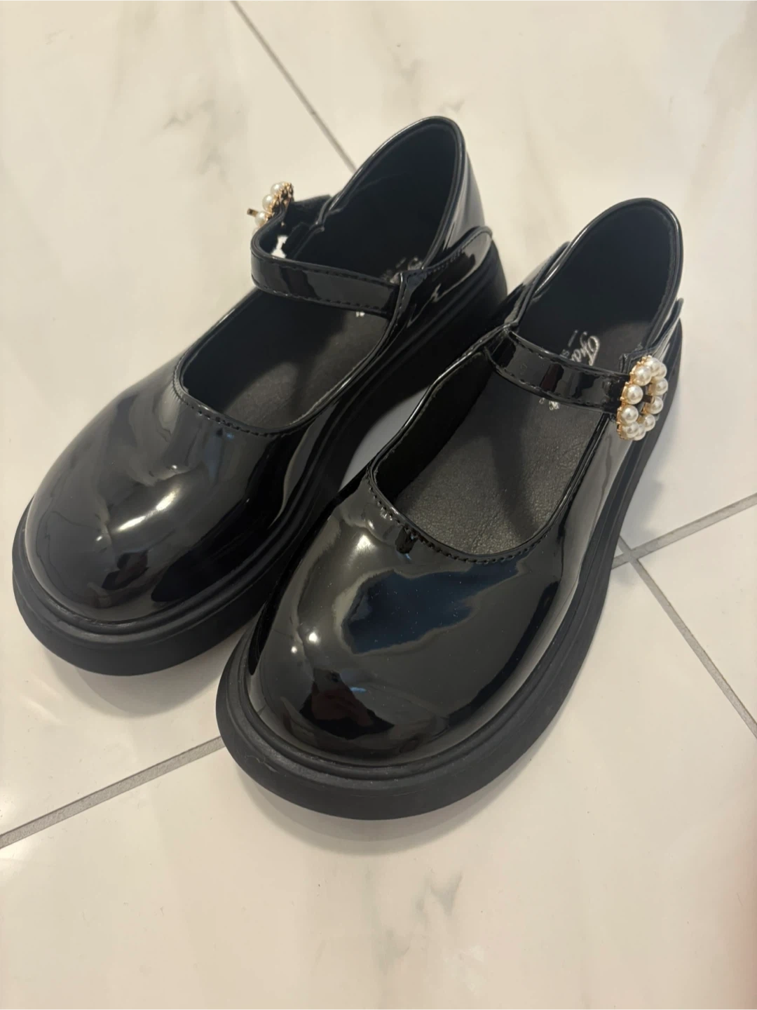 Shiny black patent Mary Jane shoes with a pearl buckle detail. These shoes are a size 230. They feature a platform sole for added height and comfort. Perfect for dressy occasions or everyday wear!