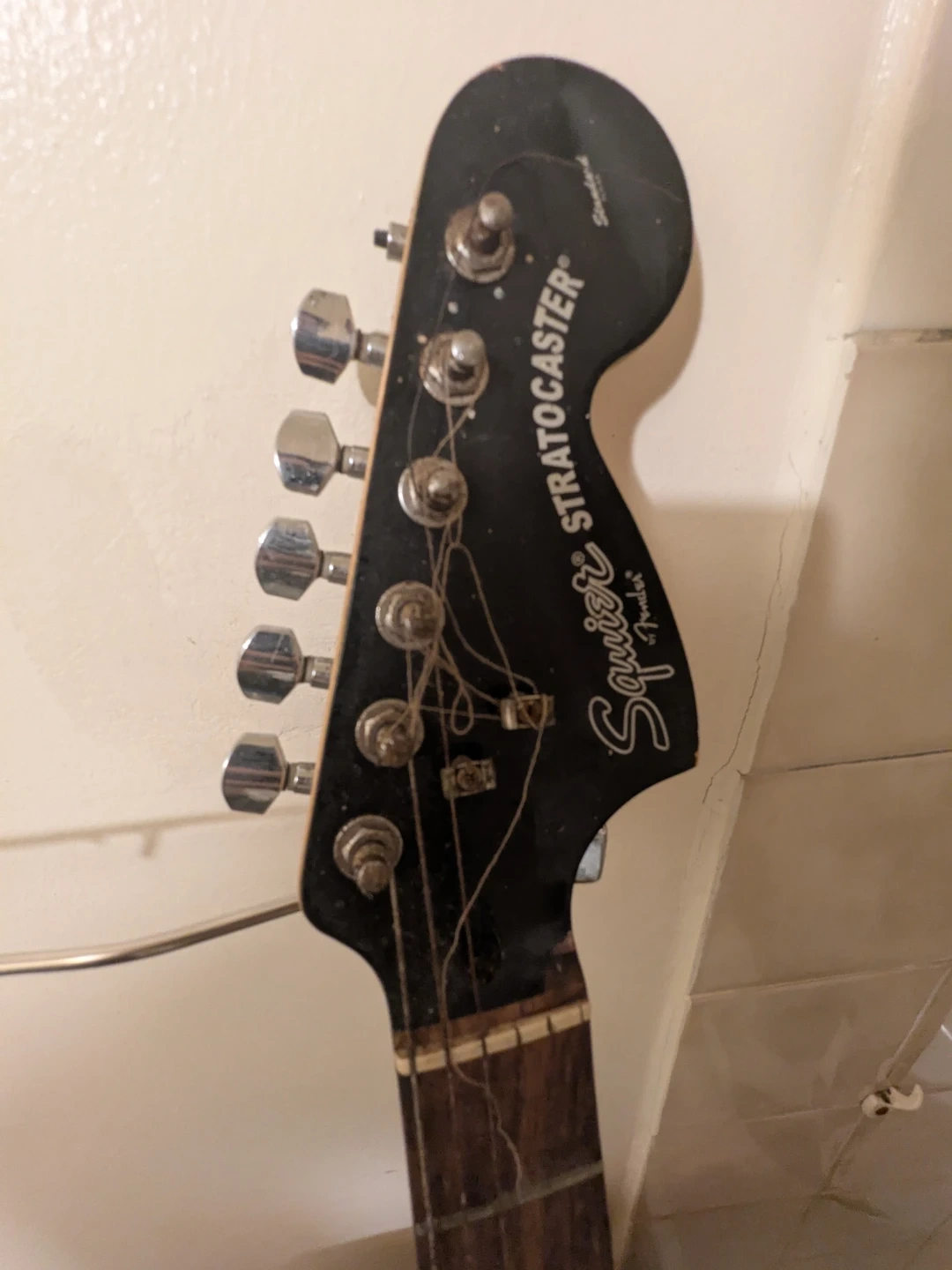 This is a Squier Stratocaster electric guitar in black. It has a standard Fender headstock and six tuning pegs. This guitar is a great starter instrument for aspiring musicians.