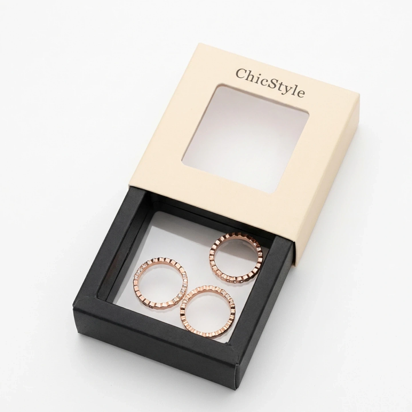A set of three stackable rings in a rose gold finish, each with a unique design. One ring features a honeycomb pattern, another has clear crystals set in a geometric design, and the third showcases a delicate heart pattern. These rings are made of metal and are sold in their original ChicStyle box.